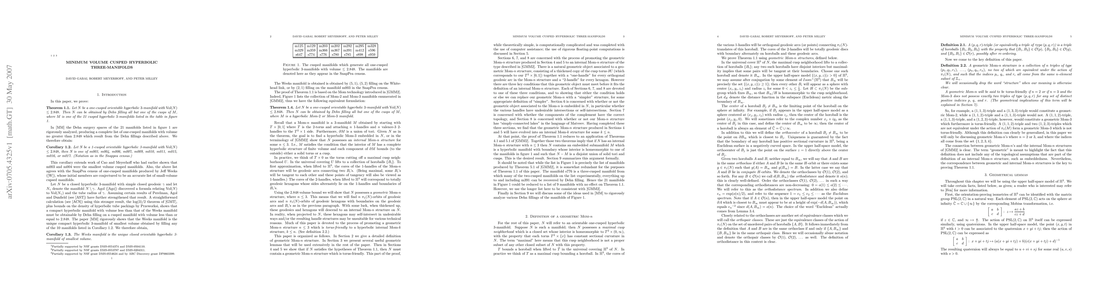 This research uses Mom technology to demonstrate that low-volume one-cusped hyperbolic 3-manifolds (volume ≤ 2.848) can be derived from 21 specific cusped hyperbolic 3-manifolds via Dehn filling, constructing a complete list of such manifolds and identifying the Weeks manifold as the smallest volume closed orientable hyperbolic 3-manifold.
