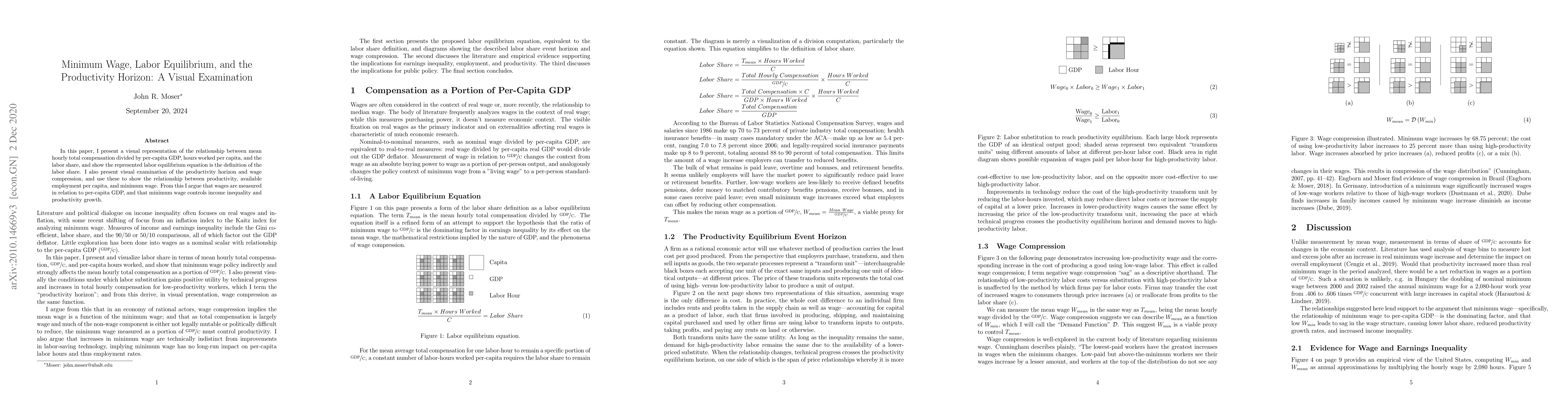 In this paper, I present a visual representation of the relationship between mean hourly total compensation divided by per-capita GDP, hours worked per capita, and the labor share, and show the represented labor equilibrium equation is the definition of the labor share. I also present visual examination of the productivity horizon and wage compression, and use these to show the relationship between productivity, available employment per capita, and minimum wage. From this I argue that wages are measured in relation to per-capita GDP, and that minimum wage controls income inequality and productivity growth.