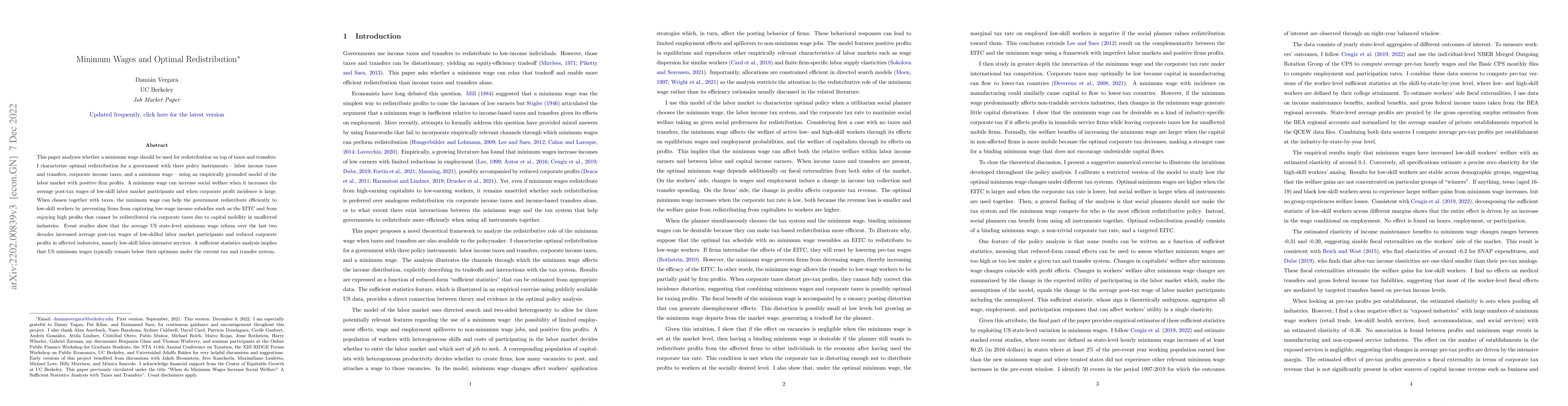 This paper explores the use of minimum wages for redistribution alongside taxes and transfers, finding that they can enhance social welfare and efficient redistribution when corporate profit incidence is significant. Empirical evidence suggests that recent minimum wage reforms in the US have increased wages for low-skilled workers and reduced corporate profits in relevant sectors.