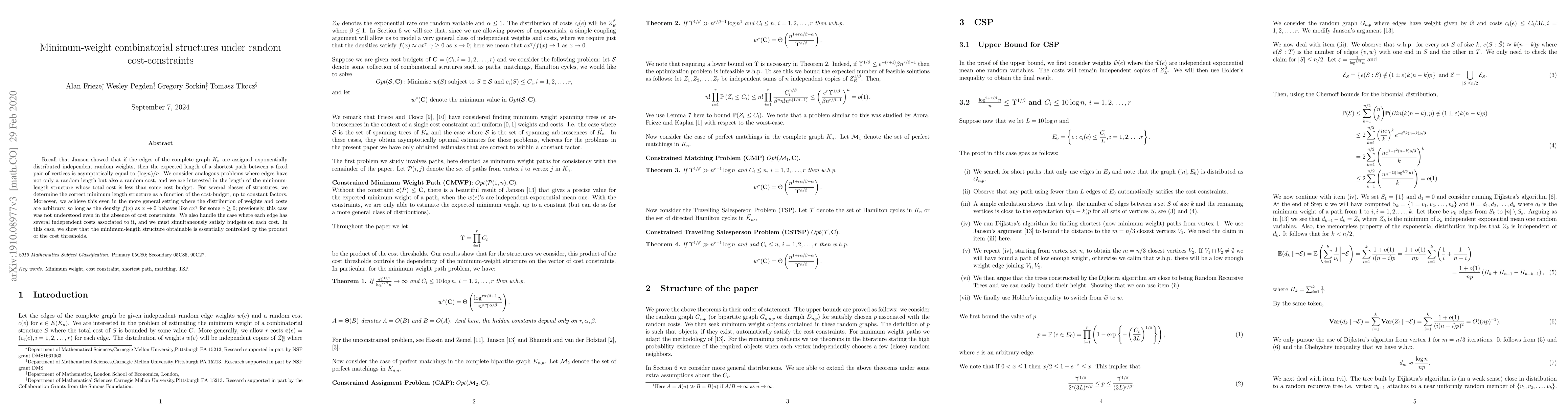 This paper studies combinatorial structures under random cost constraints and determines the minimum length structure that can be created within a budget, even in complex scenarios with arbitrary weight and cost distributions.