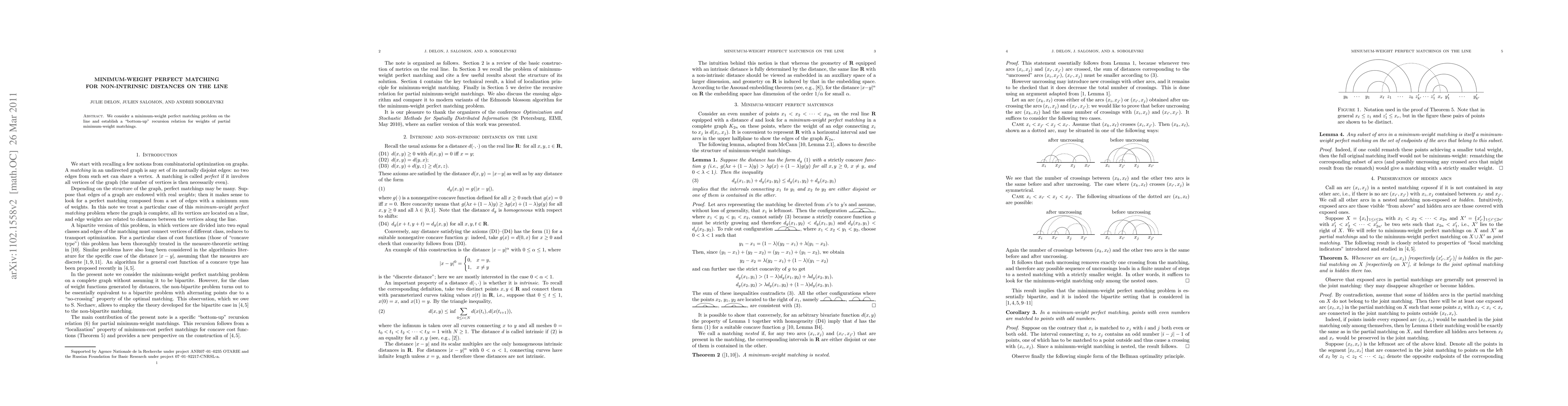 This paper addresses the minimum-weight perfect matching problem on a line with non-intrinsic distances, establishing a "bottom-up" recursion relation for the weights of partial minimum-weight matchings, which is linked to one-dimensional Monge-Kantorovich transport optimization.