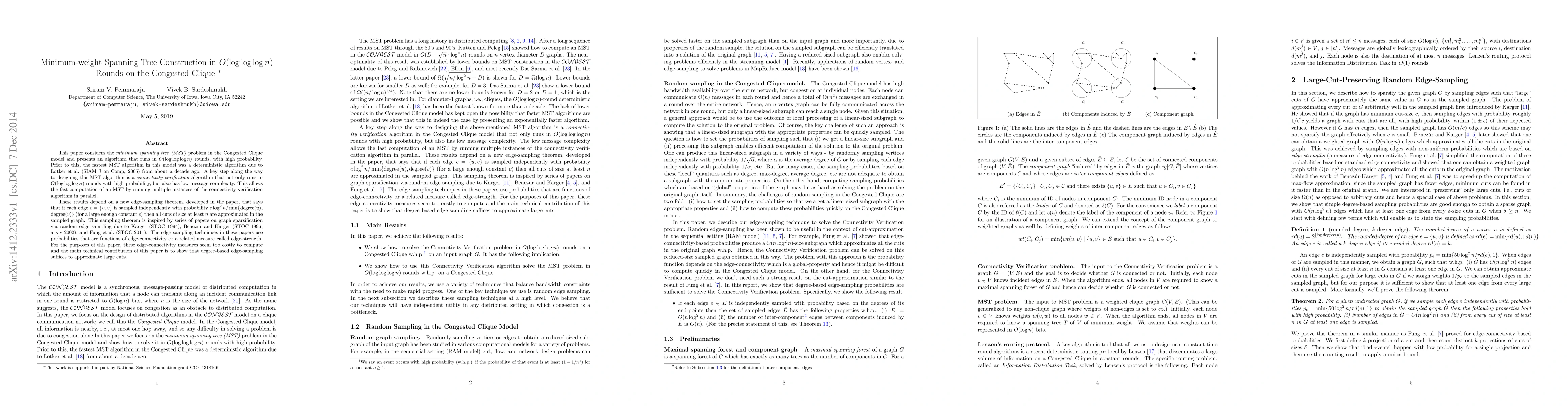 This paper presents an $O(\log \log \log n)$ round algorithm for constructing minimum spanning trees in the Congested Clique model, improving upon previous methods. The key innovation is a low-complexity connectivity verification algorithm that leverages a new edge-sampling theorem based on degree, simplifying large cut approximation.