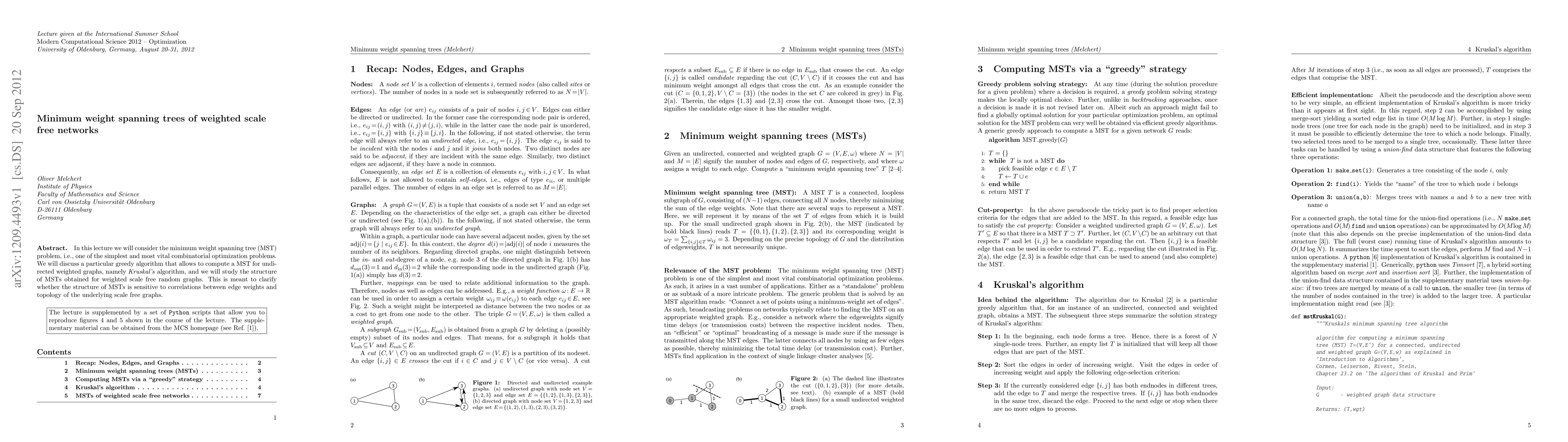 In this lecture we will consider the minimum weight spanning tree (MST) problem, i.e., one of the simplest and most vital combinatorial optimization problems. We will discuss a particular greedy algorithm that allows to compute a MST for undirected weighted graphs, namely Kruskal's algorithm, and we will study the structure of MSTs obtained for weighted scale free random graphs. This is meant to clarify whether the structure of MSTs is sensitive to correlations between edge weights and topology of the underlying scale free graphs.