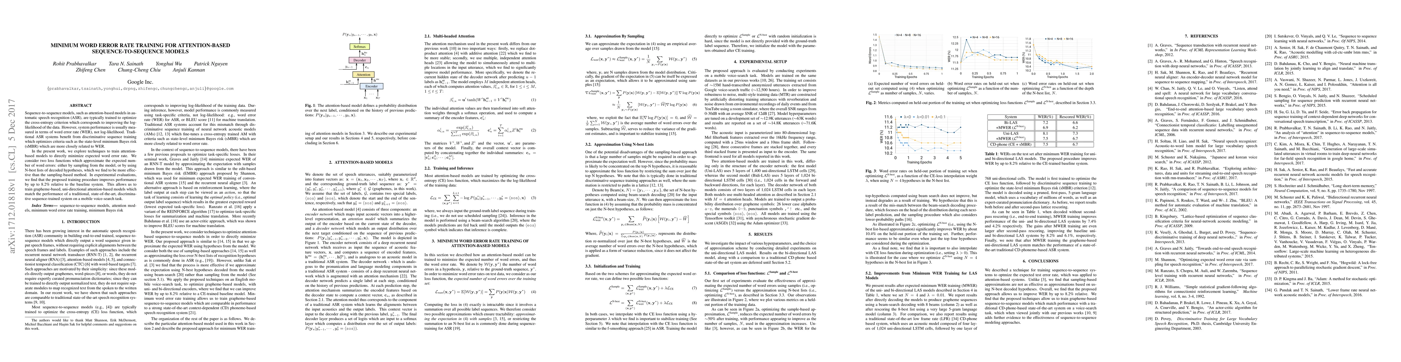 This paper proposes training attention-based sequence-to-sequence models to directly minimize expected word error rate (WER) instead of traditional log-likelihood methods, achieving up to 8.2% relative improvement and matching state-of-the-art discriminative systems' performance on a voice-search task. The most effective approach uses N-best lists for error approximation.