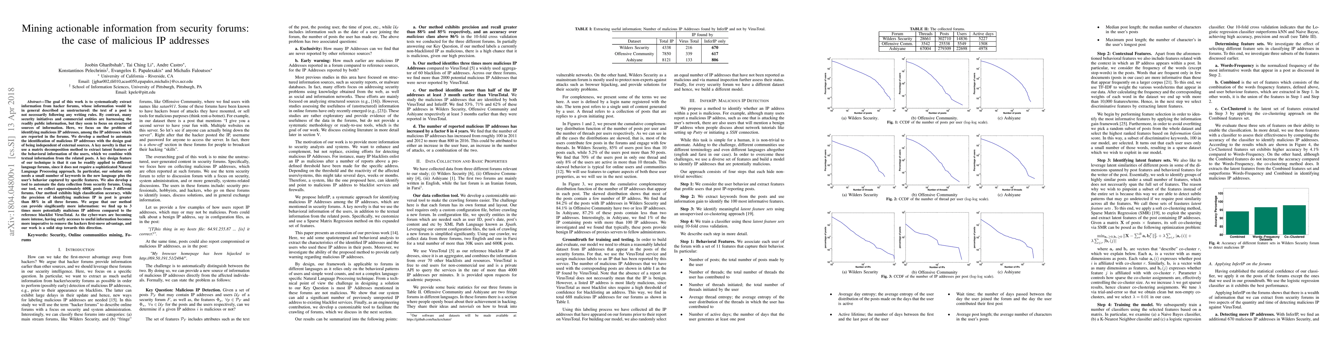 The goal of this work is to systematically extract information from hacker forums, whose information would be in general described as unstructured: the text of a post is not necessarily following any writing rules. By contrast, many security initiatives and commercial entities are harnessing the readily public information, but they seem to focus on structured sources of information. Here, we focus on the problem of identifying malicious IP addresses, among the IP addresses which are reported in the forums. We develop a method to automate the identification of malicious IP addresses with the design goal of being independent of external sources. A key novelty is that we use a matrix decomposition method to extract latent features of the behavioral information of the users, which we combine with textual information from the related posts. A key design feature of our technique is that it can be readily applied to different language forums, since it does not require a sophisticated Natural Language Processing approach. In particular, our solution only needs a small number of keywords in the new language plus the users behavior captured by specific features. We also develop a tool to automate the data collection from security forums. Using our tool, we collect approximately 600K posts from 3 different forums. Our method exhibits high classification accuracy, while the precision of identifying malicious IP in post is greater than 88% in all three forums. We argue that our method can provide significantly more information: we find up to 3 times more potentially malicious IP address compared to the reference blacklist VirusTotal. As the cyber-wars are becoming more intense, having early accesses to useful information becomes more imperative to remove the hackers first-move advantage, and our work is a solid step towards this direction.
