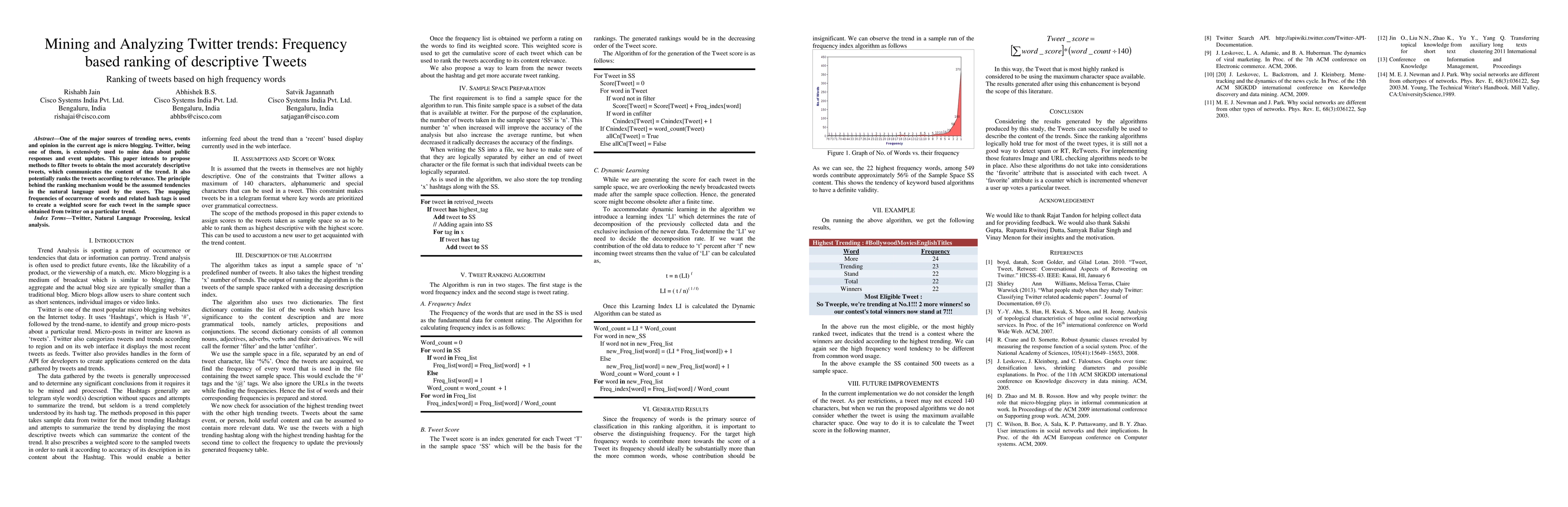 This paper proposes methods to filter and rank descriptive tweets on Twitter to accurately reflect trending news and events. It uses word and hashtag frequency mapping to create a weighted score for each tweet, thereby ranking them based on relevance to the trend.