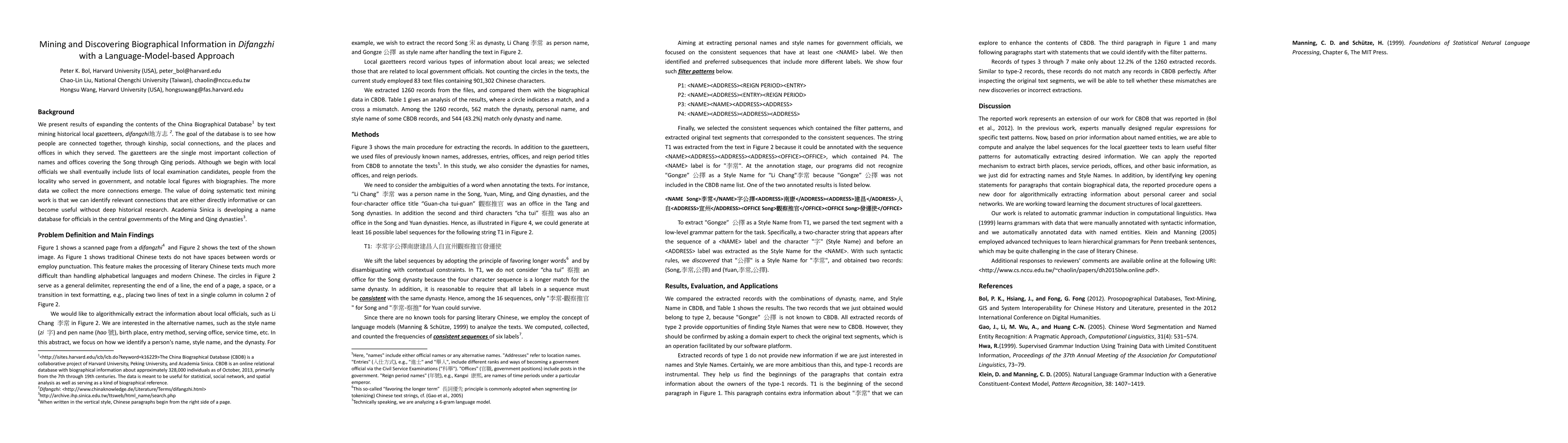 We present results of expanding the contents of the China Biographical Database by text mining historical local gazetteers, difangzhi. The goal of the database is to see how people are connected together, through kinship, social connections, and the places and offices in which they served. The gazetteers are the single most important collection of names and offices covering the Song through Qing periods. Although we begin with local officials we shall eventually include lists of local examination candidates, people from the locality who served in government, and notable local figures with biographies. The more data we collect the more connections emerge. The value of doing systematic text mining work is that we can identify relevant connections that are either directly informative or can become useful without deep historical research. Academia Sinica is developing a name database for officials in the central governments of the Ming and Qing dynasties.
