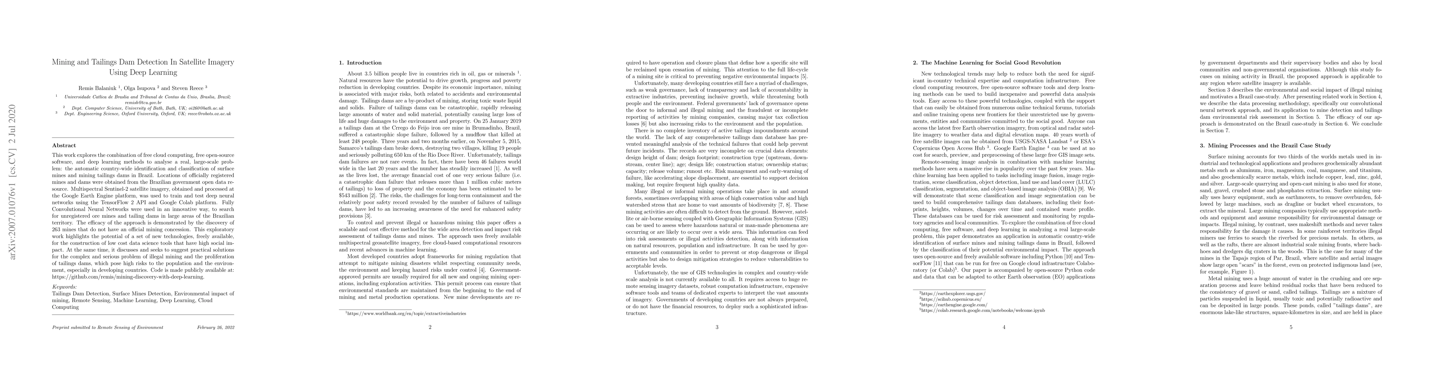 This paper utilizes deep learning and free resources to identify and classify surface mines and tailings dams in Brazil using Sentinel-2 satellite imagery. The study discovered 263 unregistered mines, demonstrating the potential of low-cost, open-source tools to address illegal mining and environmental risks.