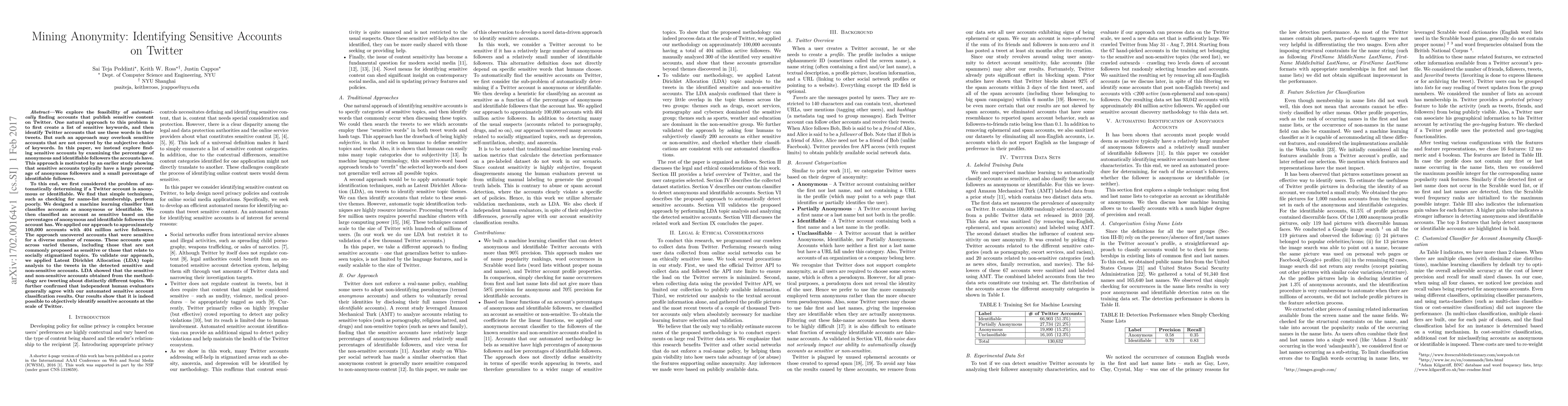 This paper proposes a method to identify sensitive Twitter accounts by analyzing the composition of followers—specifically, the percentage of anonymous versus identifiable followers. The authors developed a machine learning classifier to determine account anonymity and found that sensitive accounts typically have a higher proportion of anonymous followers. The approach successfully identified a diverse range of sensitive accounts across various themes, validated by Latent Dirichlet Allocation topic analysis showing distinct tweeting topics between sensitive and non-sensitive accounts.
