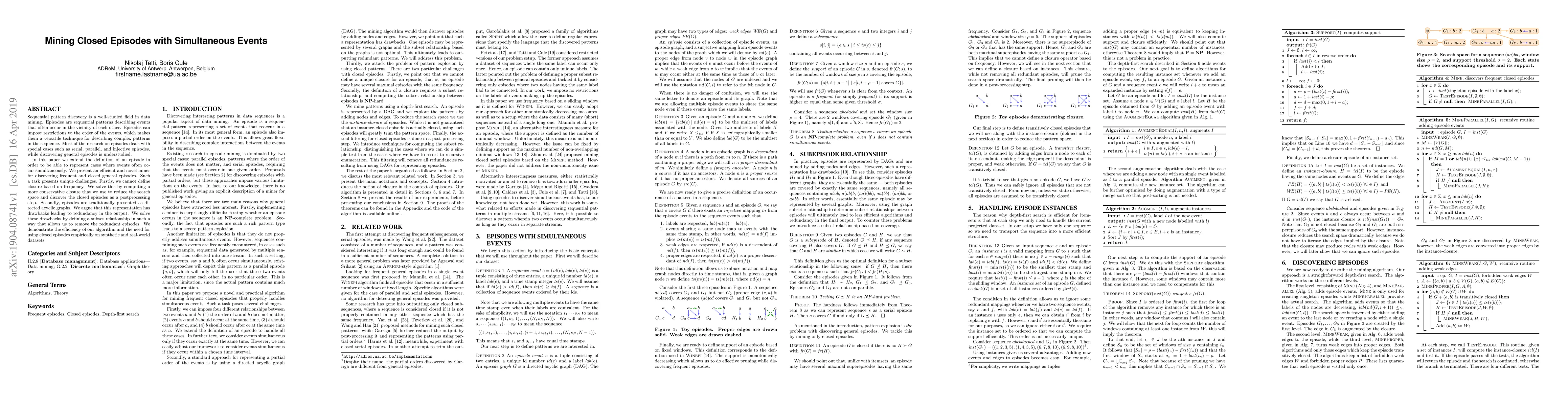 This paper introduces an efficient miner for discovering frequent and closed general episodes, addressing the understudied area of sequential pattern discovery. It overcomes challenges like non-frequency-based closure computation and redundant graph representations, demonstrating effectiveness on synthetic and real-world datasets.