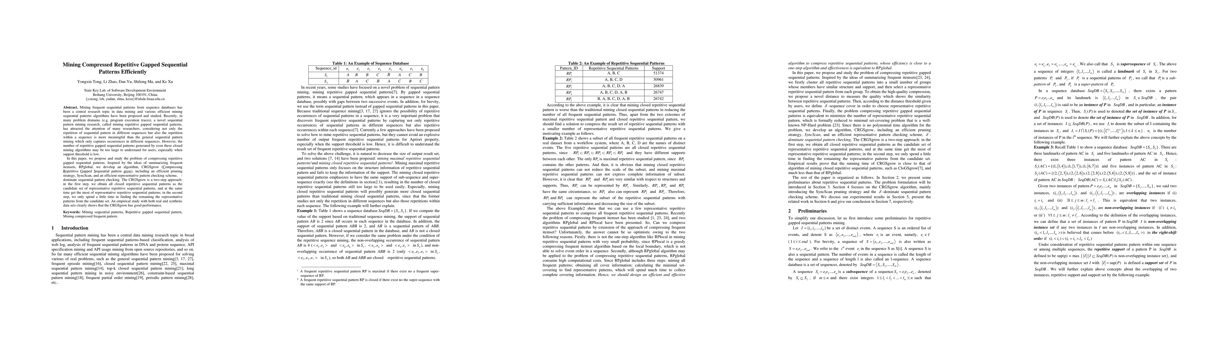This paper proposes an efficient algorithm, CRGSgrow, for mining and compressing repetitive gapped sequential patterns, which are patterns that repeat within and across sequences. The algorithm includes an effective pruning strategy and a representative pattern checking scheme, demonstrating good performance in empirical studies.