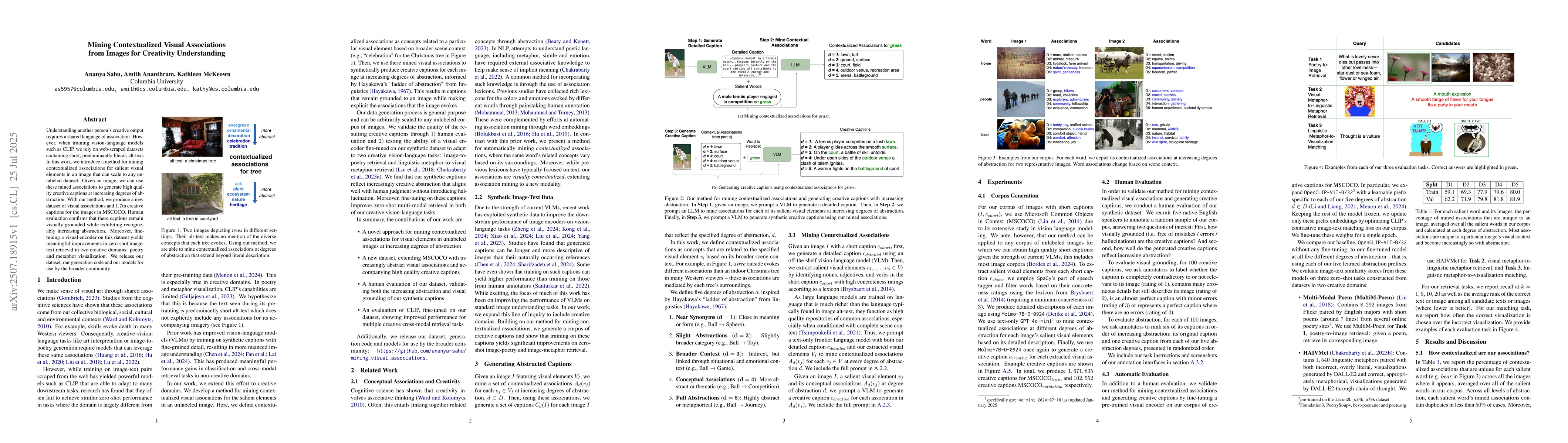 Understanding another person's creative output requires a shared language of association. However, when training vision-language models such as CLIP, we rely on web-scraped datasets containing short, predominantly literal, alt-text. In this work, we introduce a method for mining contextualized associations for salient visual elements in an image that can scale to any unlabeled dataset. Given an image, we can use these mined associations to generate high quality creative captions at increasing degrees of abstraction. With our method, we produce a new dataset of visual associations and 1.7m creative captions for the images in MSCOCO. Human evaluation confirms that these captions remain visually grounded while exhibiting recognizably increasing abstraction. Moreover, fine-tuning a visual encoder on this dataset yields meaningful improvements in zero-shot image-text retrieval in two creative domains: poetry and metaphor visualization. We release our dataset, our generation code and our models for use by the broader community.