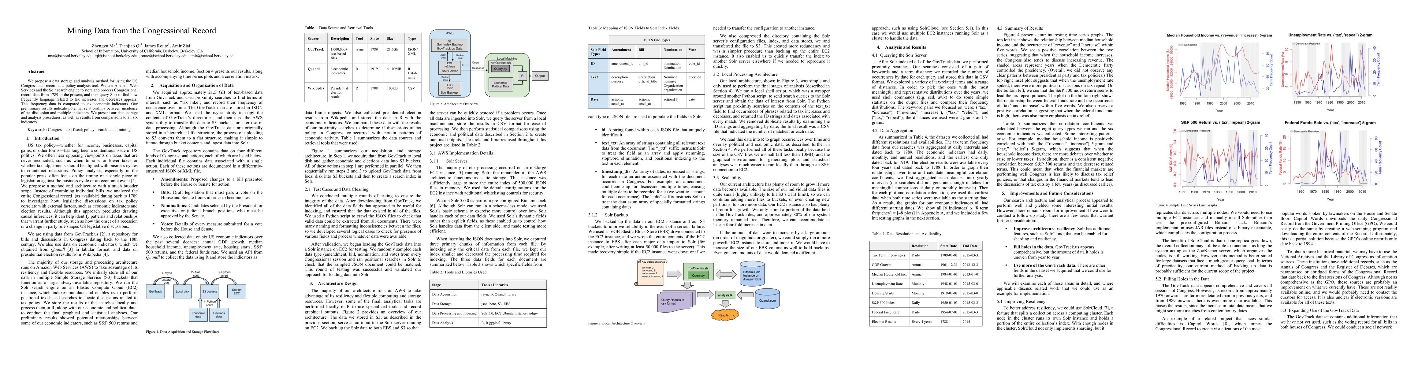 We propose a data storage and analysis method for using the US Congressional record as a policy analysis tool. We use Amazon Web Services and the Solr search engine to store and process Congressional record data from 1789 to the present, and then query Solr to find how frequently language related to tax increases and decreases appears. This frequency data is compared to six economic indicators. Our preliminary results indicate potential relationships between incidence of tax discussion and multiple indicators. We present our data storage and analysis procedures, as well as results from comparisons to all six indicators.