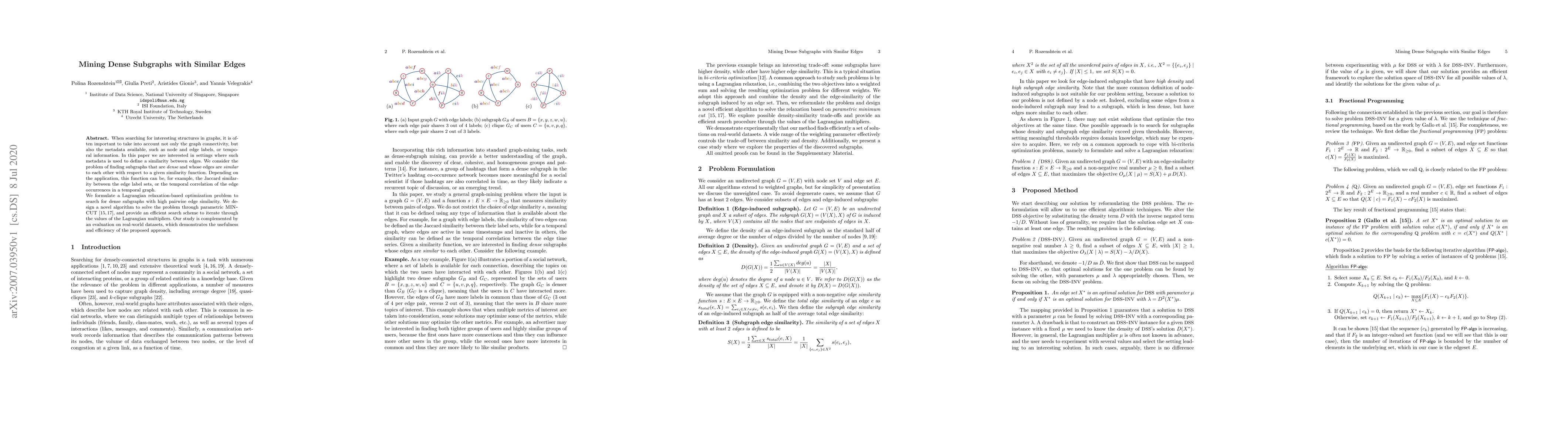 This paper proposes a method for identifying dense subgraphs in graphs where edges share similar metadata, using a Lagrangian relaxation-based optimization approach. The algorithm leverages parametric MinCut to efficiently search for optimal subgraphs, validated through real-world datasets.