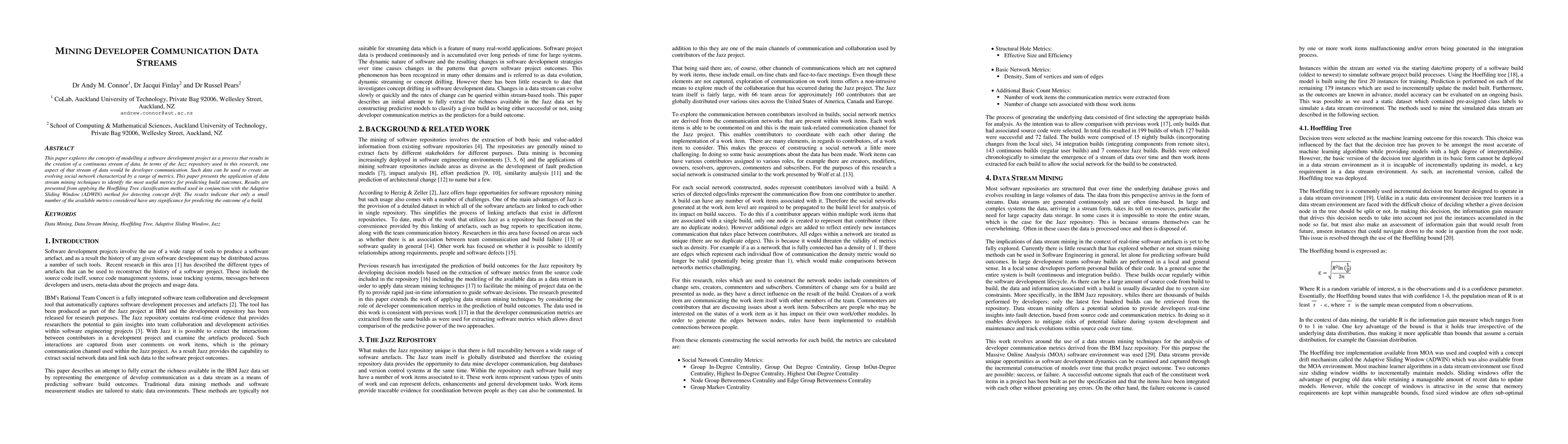 Researchers used data stream mining to analyze developer communication in software development projects and found that only a small number of metrics can predict build outcomes.