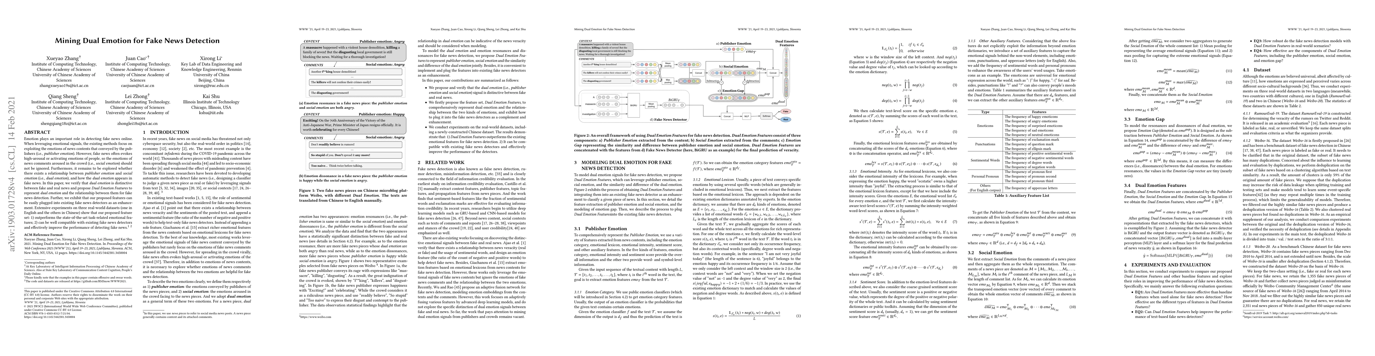 This paper explores the relationship between publisher and social emotions in fake news detection, proposing Dual Emotion Features to represent this relationship. Experiments show that these features outperform existing emotional features and enhance the performance of existing fake news detection models.