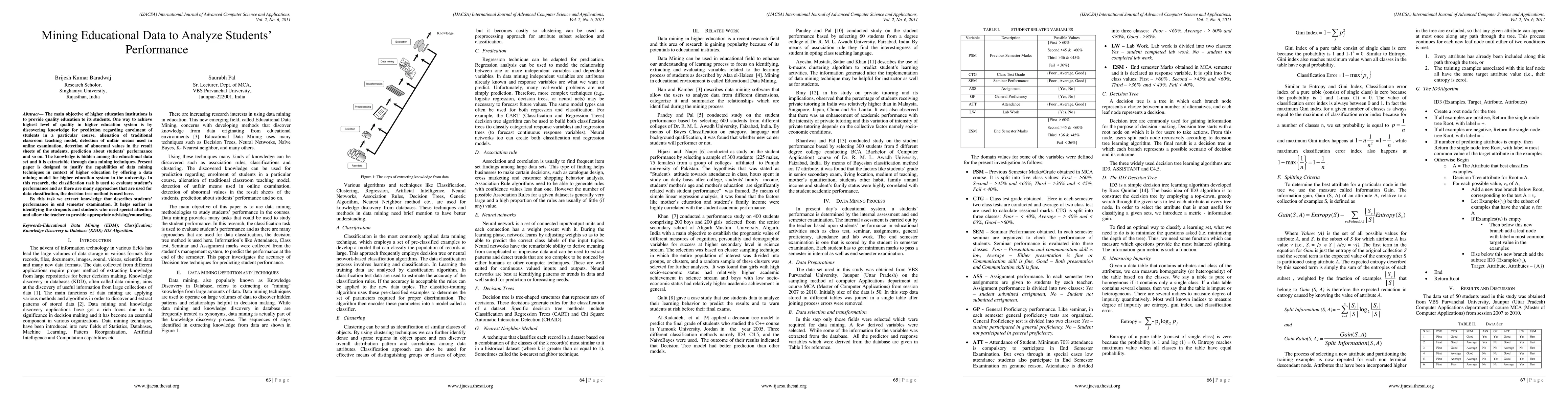 The main objective of higher education institutions is to provide quality education to its students. One way to achieve highest level of quality in higher education system is by discovering knowledge for prediction regarding enrolment of students in a particular course, alienation of traditional classroom teaching model, detection of unfair means used in online examination, detection of abnormal values in the result sheets of the students, prediction about students' performance and so on. The knowledge is hidden among the educational data set and it is extractable through data mining techniques. Present paper is designed to justify the capabilities of data mining techniques in context of higher education by offering a data mining model for higher education system in the university. In this research, the classification task is used to evaluate student's performance and as there are many approaches that are used for data classification, the decision tree method is used here. By this task we extract knowledge that describes students' performance in end semester examination. It helps earlier in identifying the dropouts and students who need special attention and allow the teacher to provide appropriate advising/counseling. Keywords-Educational Data Mining (EDM); Classification; Knowledge Discovery in Database (KDD); ID3 Algorithm.
