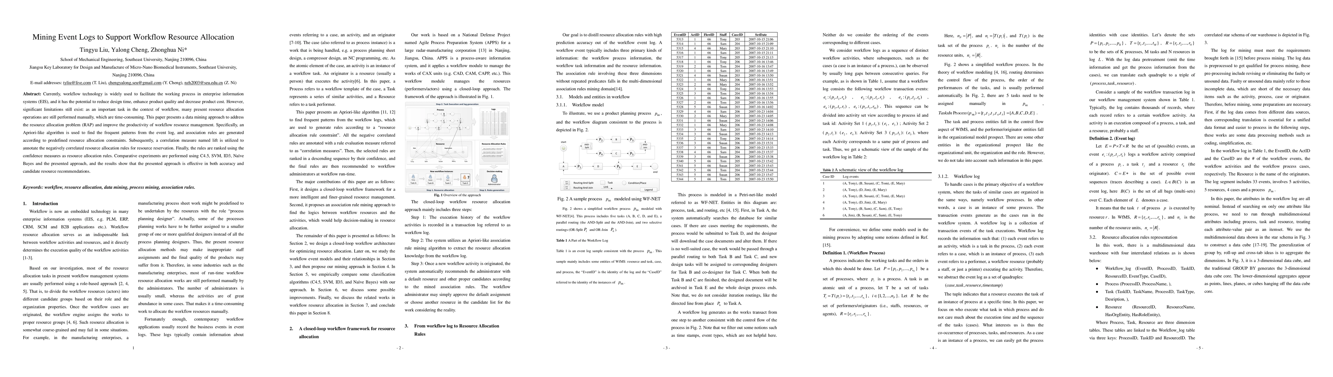 This paper proposes a data mining method to automate workflow resource allocation by mining event logs to identify frequent patterns and generate resource allocation rules, which improves workflow management efficiency. Comparative experiments show that this approach outperforms traditional methods in accuracy and resource recommendation.