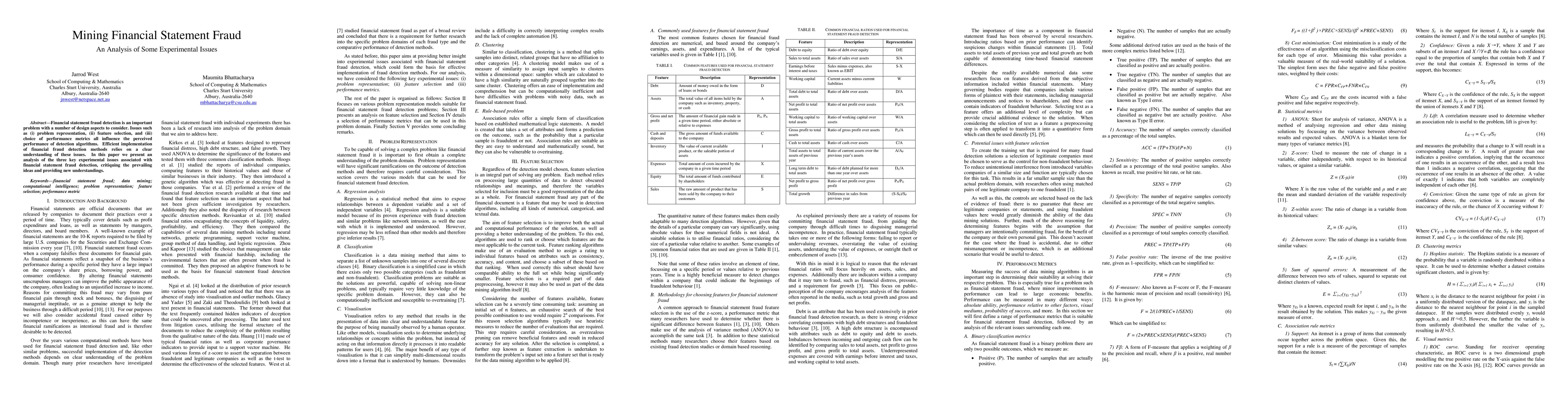This paper analyzes and critiques three key experimental issues—problem representation, feature selection, and performance metrics—in financial statement fraud detection, aiming to improve the understanding and efficiency of fraud detection methods. It provides new insights into the design aspects that influence detection algorithm performance.