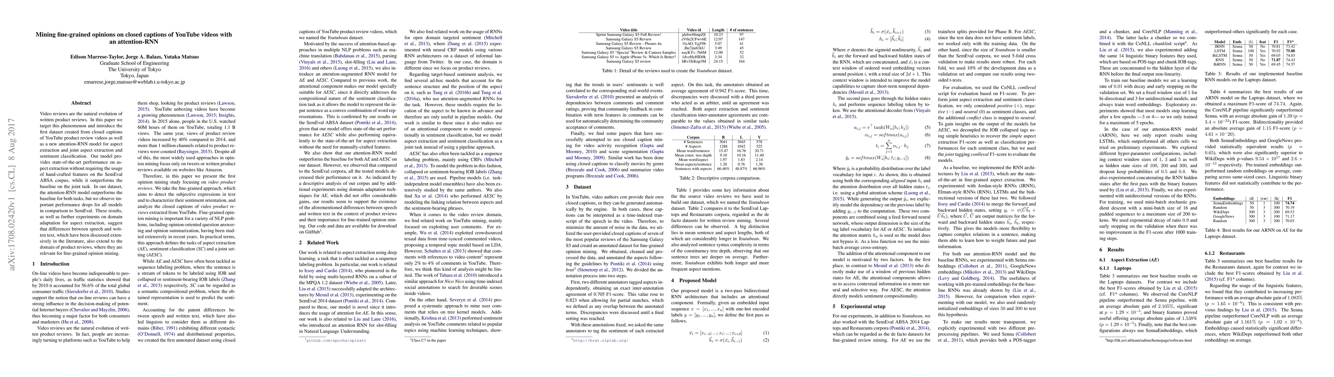 This paper introduces a new dataset derived from YouTube product review videos' closed captions and an attention-RNN model for aspect extraction and sentiment classification. The model achieves state-of-the-art performance on aspect extraction and outperforms baselines, though it shows significant drops compared to written text benchmarks, highlighting differences between speech and written text in fine-grained opinion mining.
