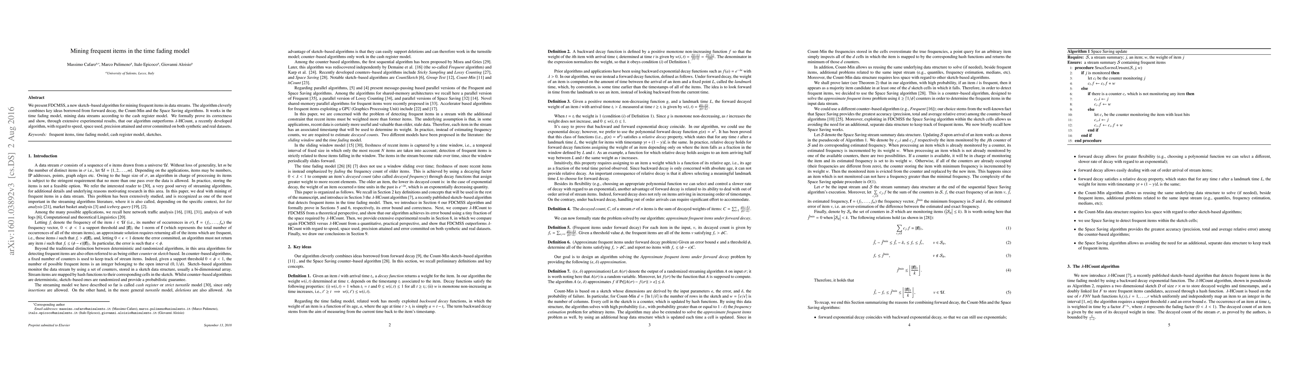 We present FDCMSS, a new sketch-based algorithm for mining frequent items in data streams. The algorithm cleverly combines key ideas borrowed from forward decay, the Count-Min and the Space Saving algorithms. It works in the time fading model, mining data streams according to the cash register model. We formally prove its correctness and show, through extensive experimental results, that our algorithm outperforms $\lambda$-HCount, a recently developed algorithm, with regard to speed, space used, precision attained and error committed on both synthetic and real datasets.
