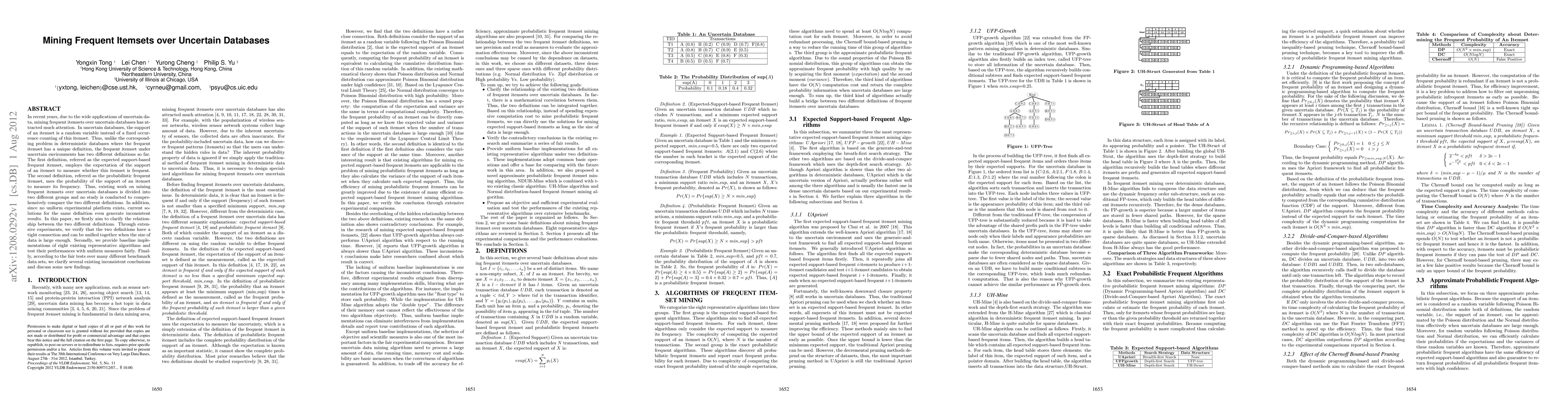 This paper investigates the mining of frequent itemsets over uncertain databases, comparing two definitions: expected support-based and probabilistic frequent itemsets. It demonstrates a unified relationship between the two definitions when data size is large and provides a fair comparison of eight representative algorithms across various benchmarks.