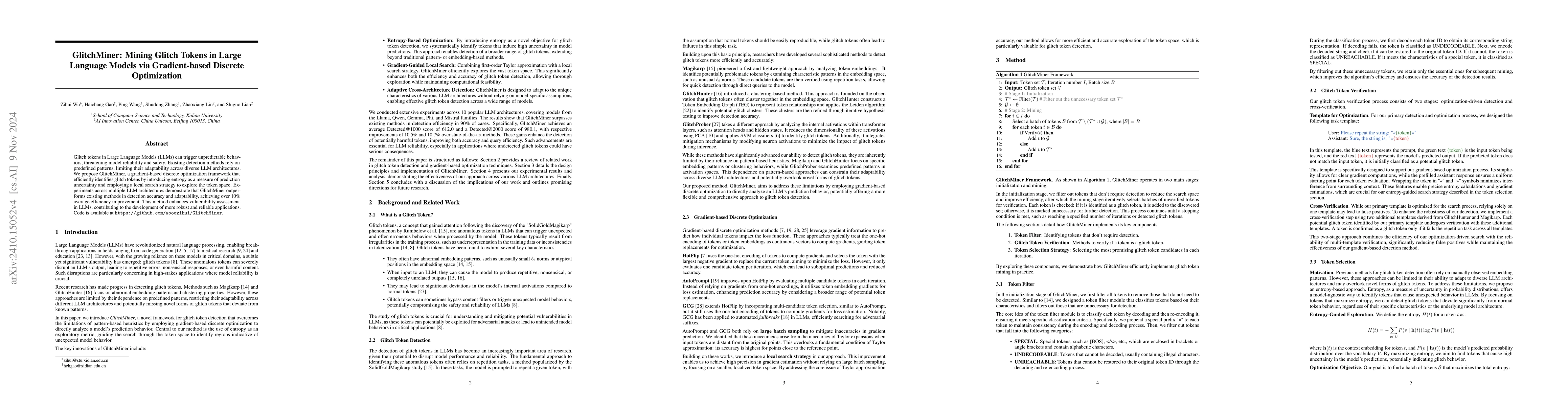 GlitchMiner introduces a gradient-based discrete optimization framework to efficiently detect glitch tokens in Large Language Models, surpassing existing methods with a 19.07% improvement in detection precision. This framework enhances model reliability and safety by utilizing an entropy-based loss function and local search strategies.