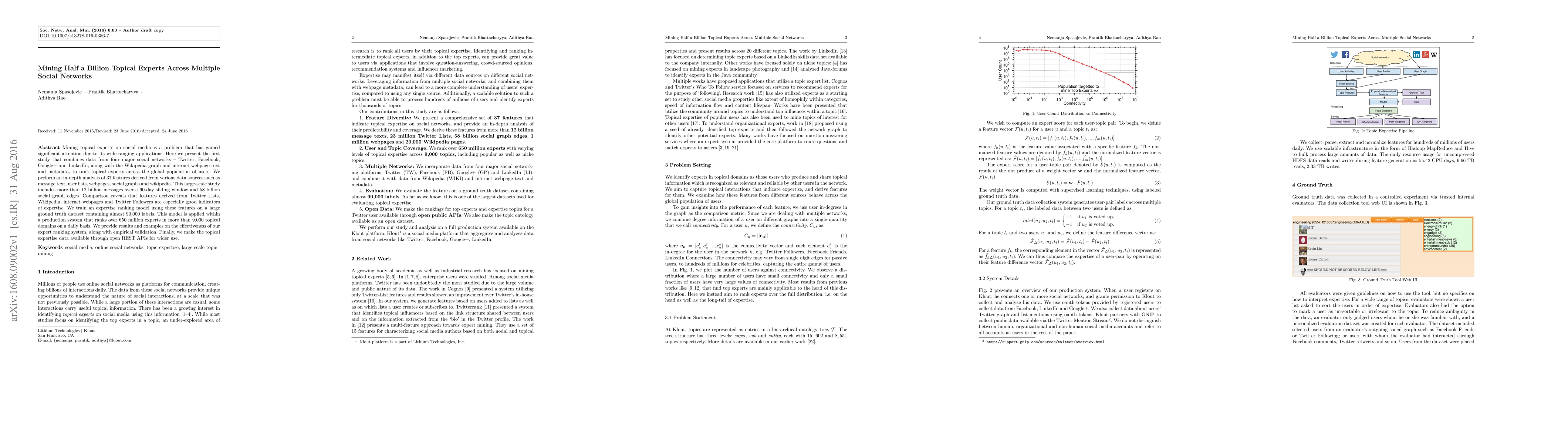 This paper presents a comprehensive study on identifying topical experts across multiple social networks, combining data from Twitter, Facebook, Google+, LinkedIn, Wikipedia, and internet webpages. The study ranks experts using 37 features derived from various sources, and trains a model on a dataset of nearly 90,000 labels, which is used to rank over 650 million experts daily.