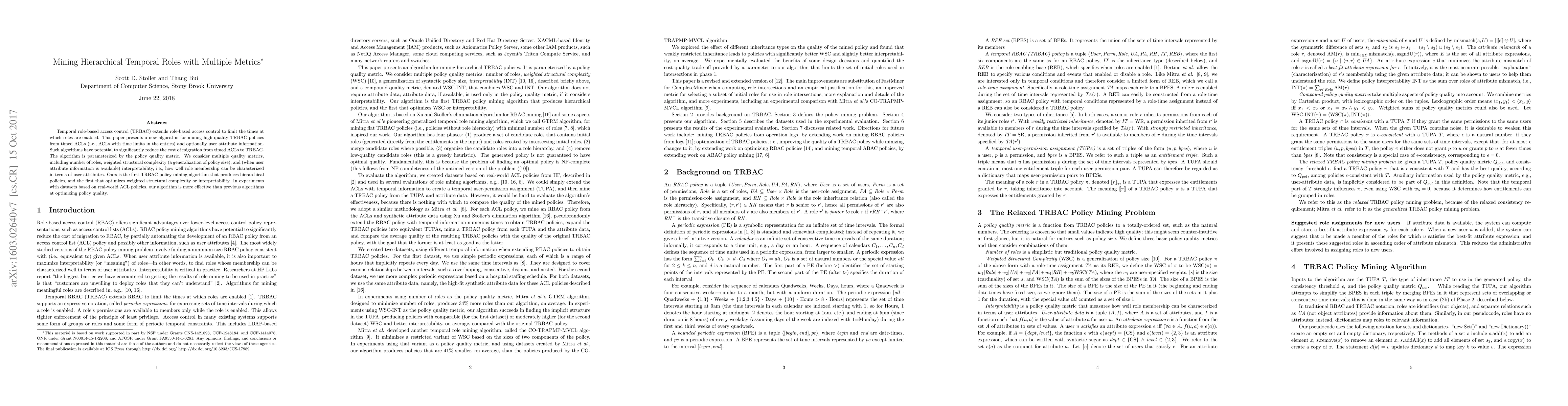 This paper introduces an algorithm for mining high-quality hierarchical temporal role-based access control (TRBAC) policies from timed ACLs, optimizing for multiple metrics including role count, structural complexity, and interpretability using user attributes. The algorithm outperforms previous methods in experiments with real-world datasets.