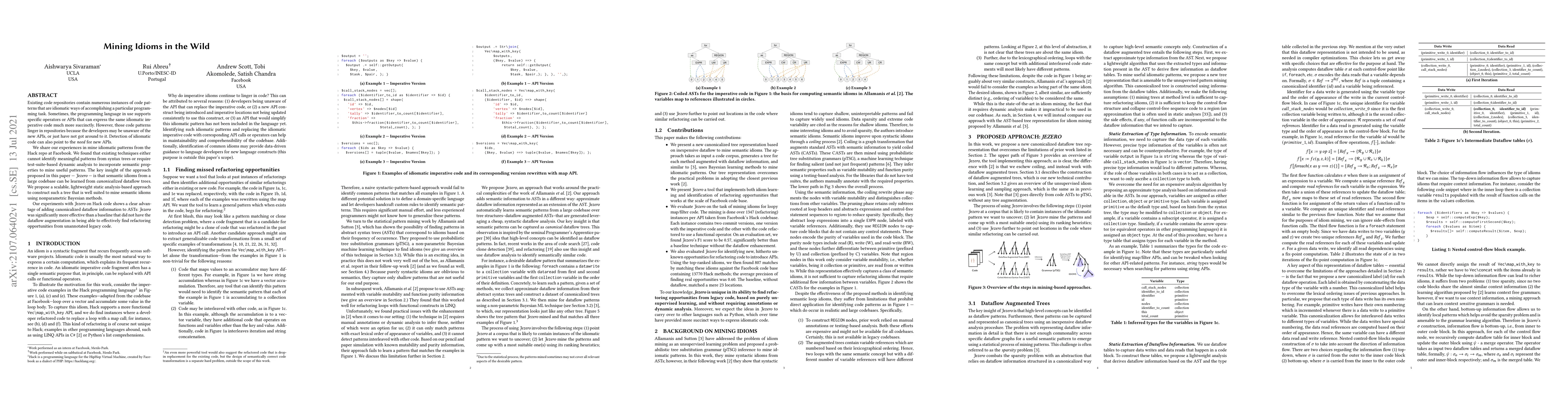 This paper proposes a method called Jezero to mine idiomatic code patterns from large codebases, specifically using the Hack language at Facebook. It introduces a scalable, lightweight static analysis approach that constructs canonicalized dataflow trees to identify semantic idioms, outperforming baselines by effectively finding refactoring opportunities in unannotated legacy code.