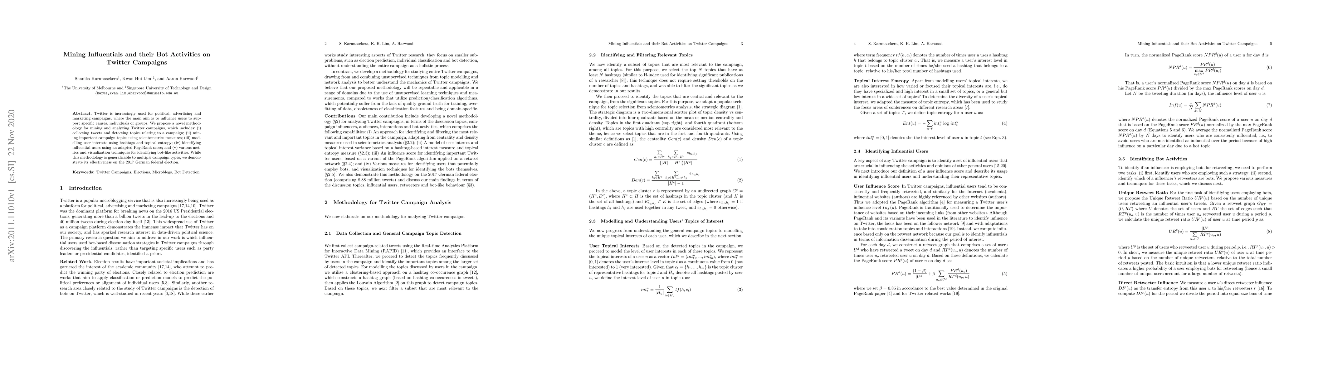 This paper proposes a novel methodology for analyzing Twitter campaigns, focusing on identifying influential users and bot-like activities. It includes topic detection, scientometrics analysis, user interest modeling, and an adapted PageRank score for influential users, demonstrated through the 2017 German federal election.