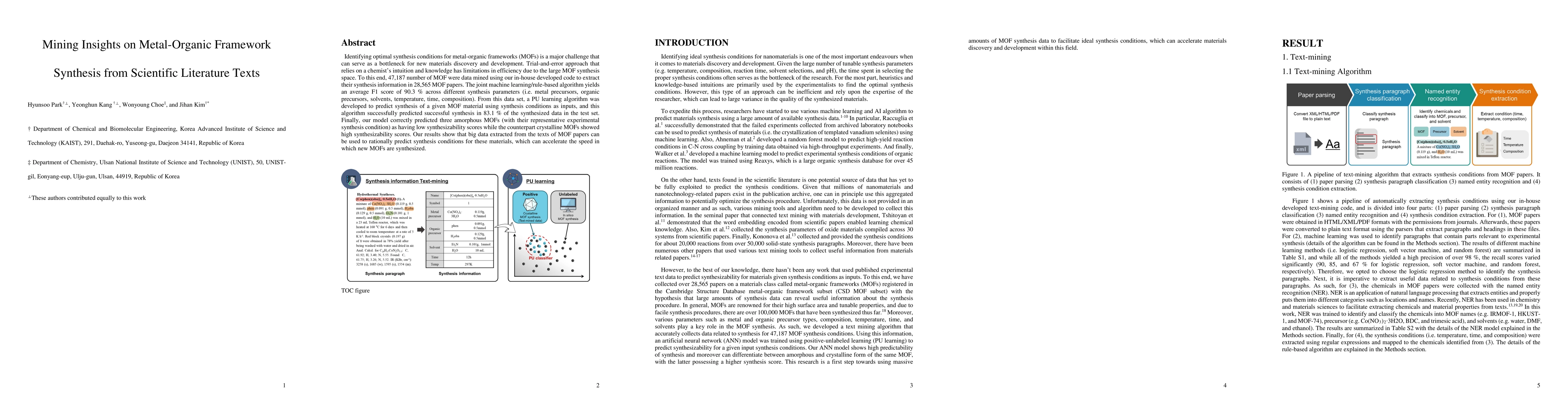This paper presents a machine learning/rule-based approach to extract and analyze synthesis information from 28,565 scientific papers on metal-organic frameworks (MOFs), achieving an F1 score of 90.3%. The developed PU learning algorithm successfully predicts MOF synthesis conditions with 83.1% accuracy, demonstrating the potential of big data to accelerate MOF discovery.