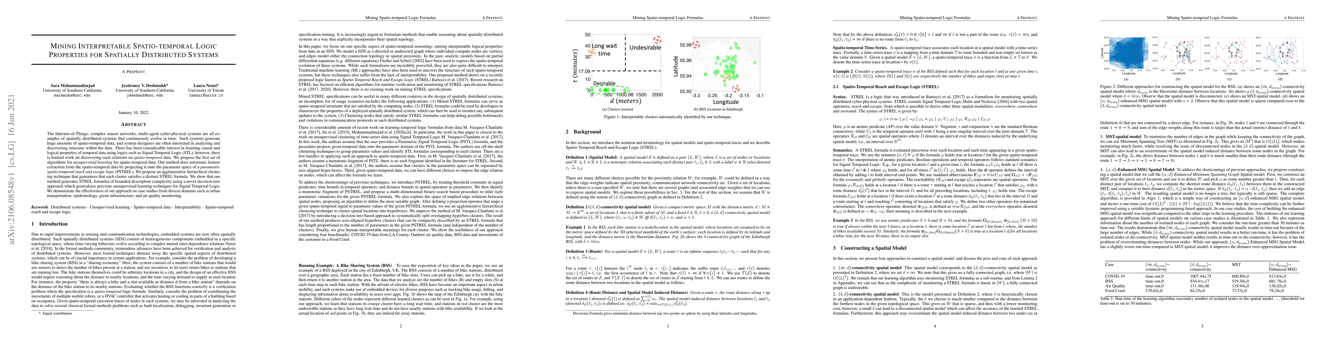 This paper proposes algorithms for unsupervised learning of spatio-temporal logic properties from large datasets generated by spatially distributed systems. It introduces a novel method for automatic feature extraction and clustering to discover distinct spatio-temporal relations, demonstrating effectiveness across various domains.