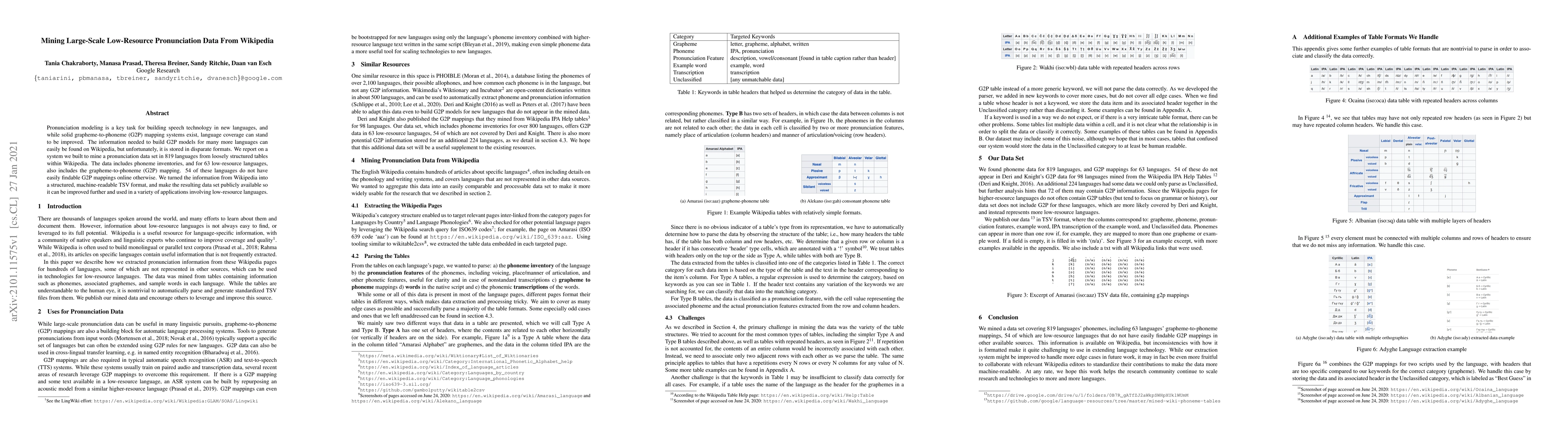 Researchers developed a system to extract pronunciation data from Wikipedia, creating a machine-readable dataset for 819 languages, including phoneme inventories and grapheme-to-phoneme mappings for 54 low-resource languages.