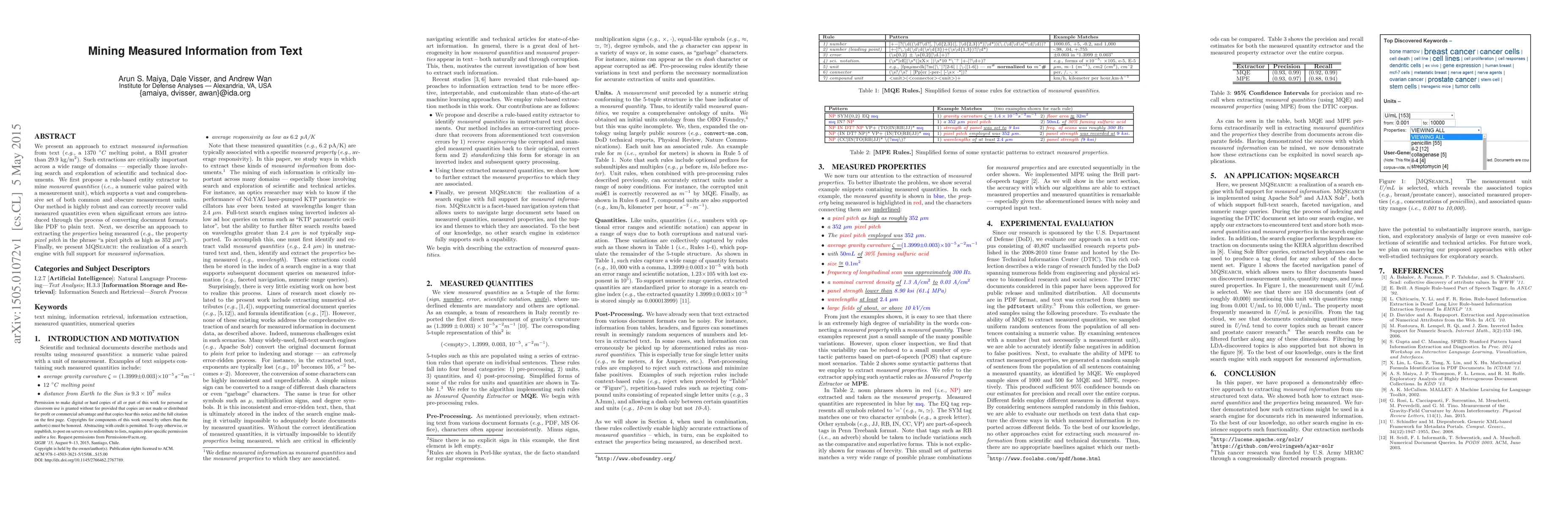 This paper presents a method to extract measured information from text, including quantities and properties, with high accuracy even in noisy documents. The approach is realized through a search engine called MQSearch that supports full-text searching with measured information.