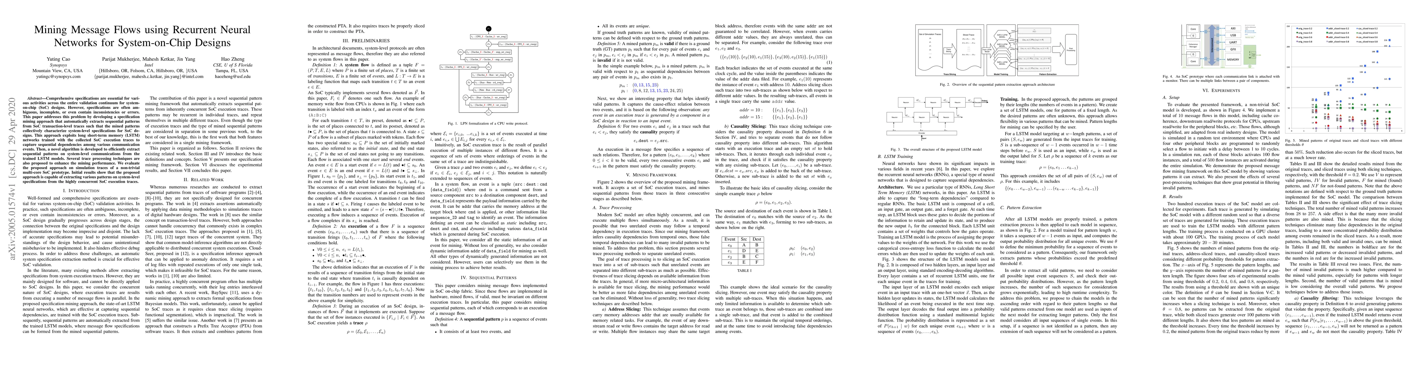 This paper proposes a method using LSTM networks to automatically extract sequential patterns from SoC transaction-level traces, which characterizes system-level specifications for SoC designs. The approach includes an efficient algorithm to extract these patterns, along with trace processing techniques to enhance performance.