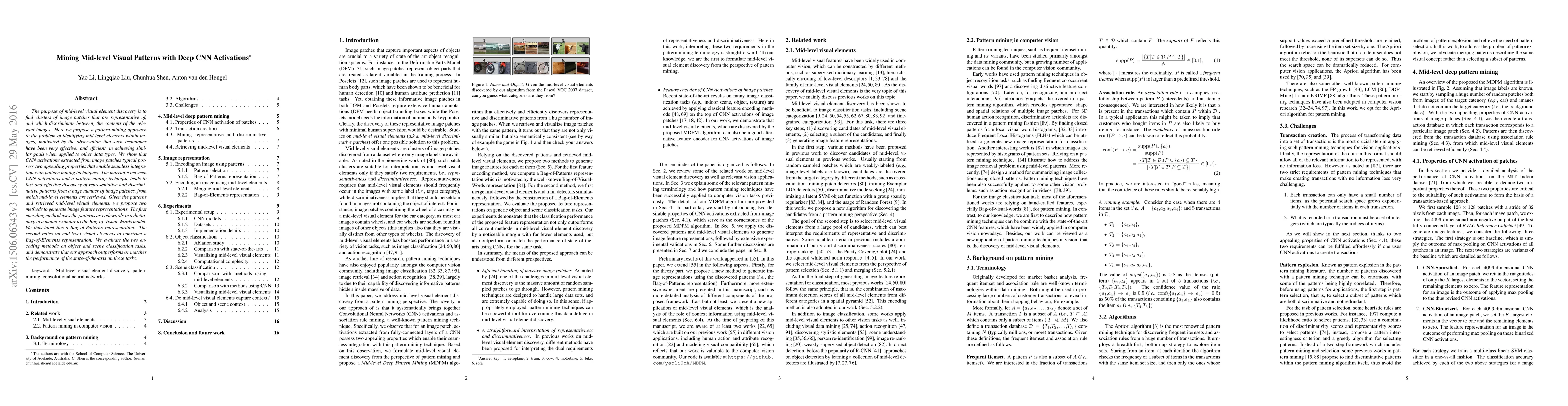 This research explores the discovery of mid-level visual patterns using Convolutional Neural Networks (CNNs) and pattern mining techniques. By combining CNN activations with association rule mining, the study identifies representative and discriminative patterns from numerous image patches, leading to the creation of mid-level visual elements. The paper proposes two methods for generating image feature representations based on these patterns and elements, demonstrating their effectiveness in scene and object classification tasks.