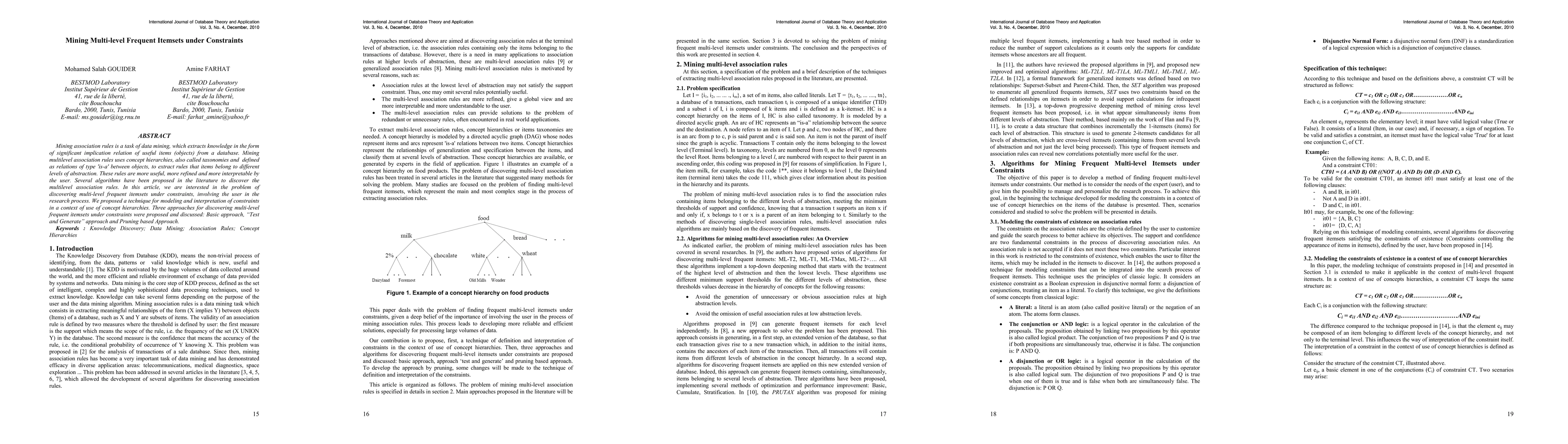 This paper proposes techniques for discovering multi-level frequent itemsets under constraints using concept hierarchies. It introduces three approaches: Basic, "Test and Generate," and Pruning based, and discusses their modeling and interpretation in the context of user-defined constraints.