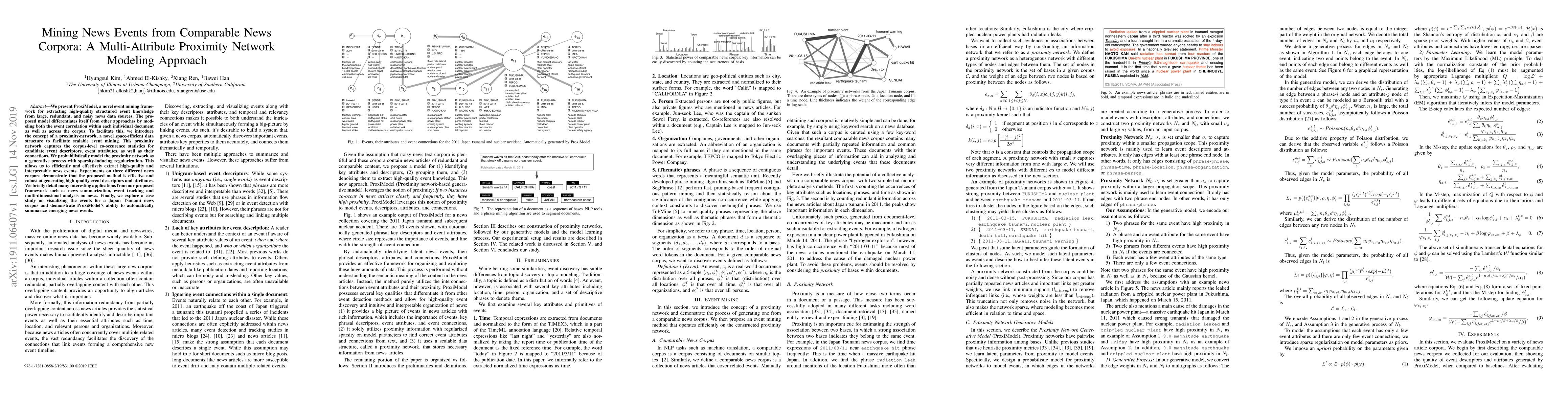 We present ProxiModel, a novel event mining framework for extracting high-quality structured event knowledge from large, redundant, and noisy news data sources. The proposed model differentiates itself from other approaches by modeling both the event correlation within each individual document as well as across the corpus. To facilitate this, we introduce the concept of a proximity-network, a novel space-efficient data structure to facilitate scalable event mining. This proximity network captures the corpus-level co-occurence statistics for candidate event descriptors, event attributes, as well as their connections. We probabilistically model the proximity network as a generative process with sparsity-inducing regularization. This allows us to efficiently and effectively extract high-quality and interpretable news events. Experiments on three different news corpora demonstrate that the proposed method is effective and robust at generating high-quality event descriptors and attributes. We briefly detail many interesting applications from our proposed framework such as news summarization, event tracking and multi-dimensional analysis on news. Finally, we explore a case study on visualizing the events for a Japan Tsunami news corpus and demonstrate ProxiModel's ability to automatically summarize emerging news events.