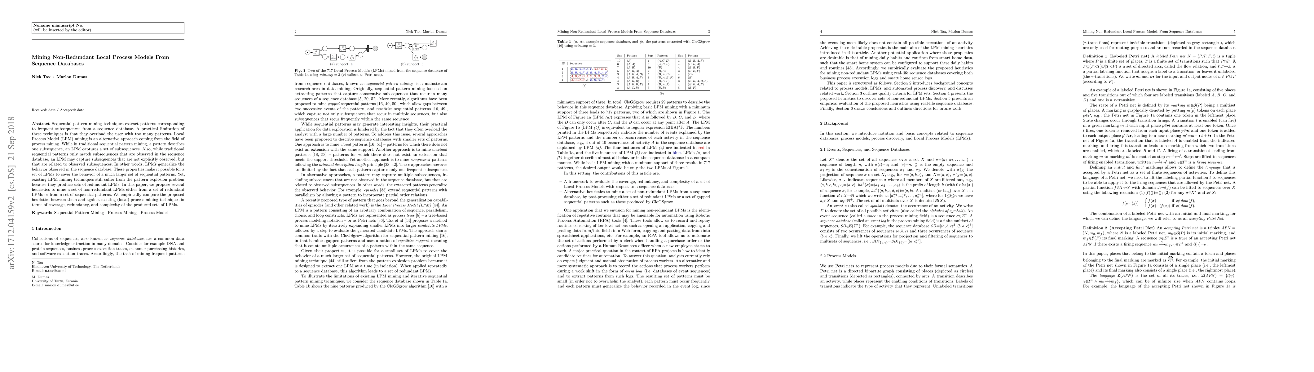 This paper proposes heuristics to mine non-redundant Local Process Models (LPMs) from sequence databases, addressing the pattern explosion problem in traditional LPM mining. The study compares the effectiveness of the proposed heuristics against existing techniques in terms of coverage, redundancy, and complexity.