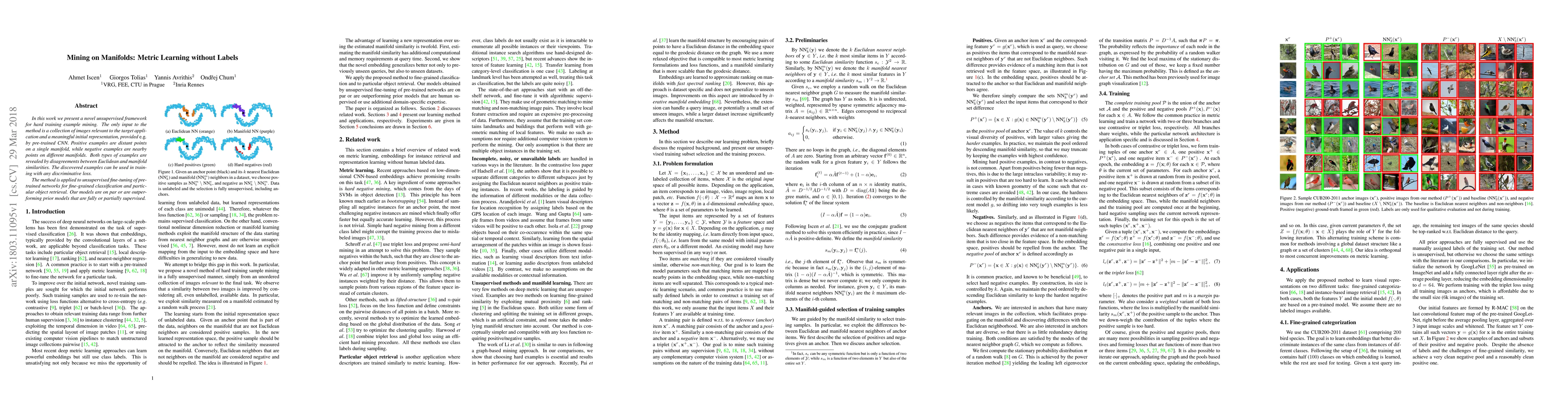 In this work we present a novel unsupervised framework for hard training example mining. The only input to the method is a collection of images relevant to the target application and a meaningful initial representation, provided e.g. by pre-trained CNN. Positive examples are distant points on a single manifold, while negative examples are nearby points on different manifolds. Both types of examples are revealed by disagreements between Euclidean and manifold similarities. The discovered examples can be used in training with any discriminative loss. The method is applied to unsupervised fine-tuning of pre-trained networks for fine-grained classification and particular object retrieval. Our models are on par or are outperforming prior models that are fully or partially supervised.