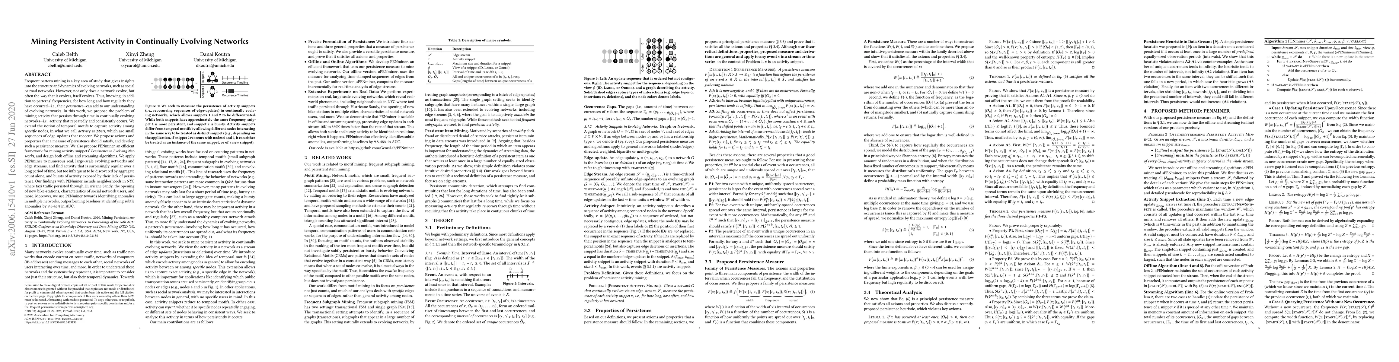 This paper proposes a method for mining persistent activity in continually evolving networks, introducing the concept of "activity snippets" to capture recurring patterns. It develops a persistence measure and PENminer framework for efficient mining, demonstrating its application in identifying long-term regular activities and anomalies in large-scale networks.