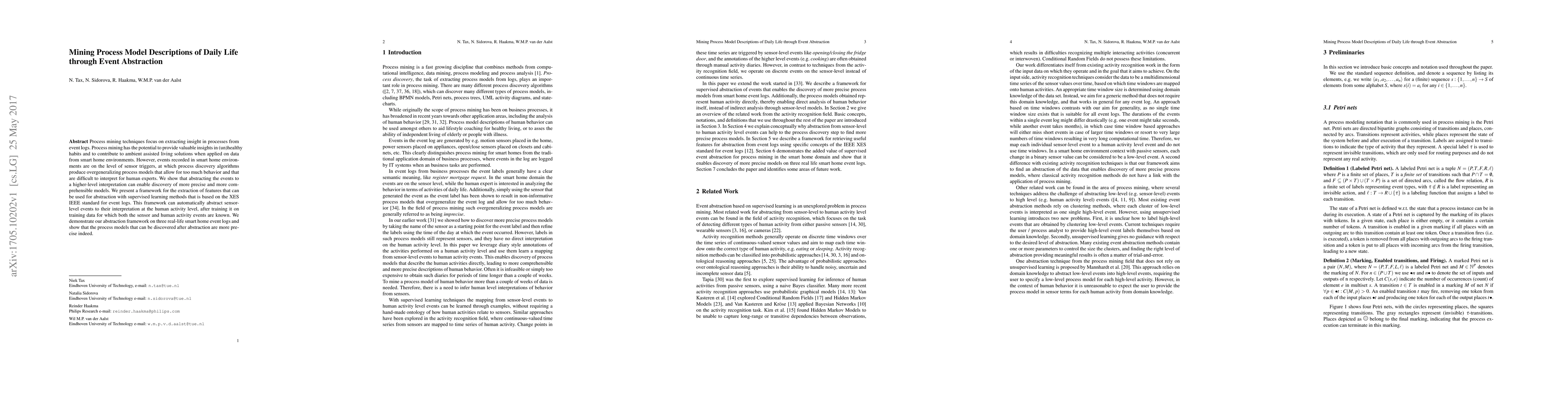 This paper proposes a framework for abstracting sensor-level events in smart home environments to human activity levels using supervised learning, aiming to create more precise and interpretable process models for ambient assisted living. The framework, based on the XES IEEE standard, demonstrates improved process model accuracy on real-life smart home data.