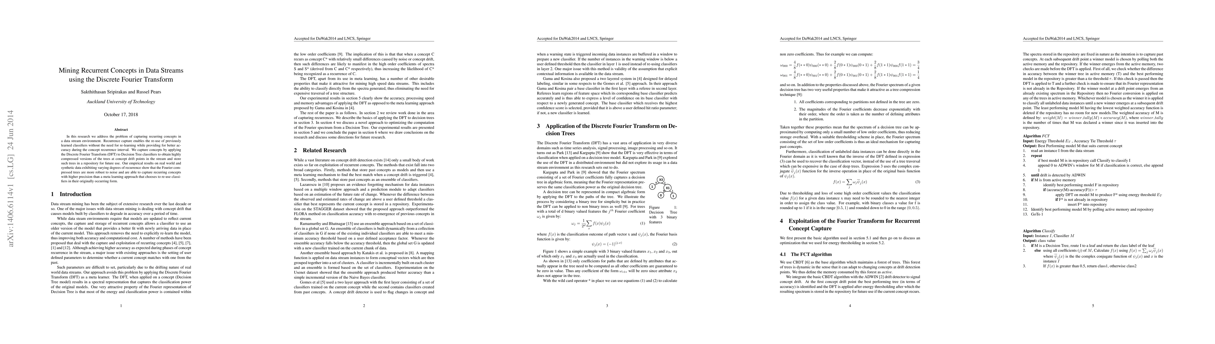 In this research we address the problem of capturing recurring concepts in a data stream environment. Recurrence capture enables the re-use of previously learned classifiers without the need for re-learning while providing for better accuracy during the concept recurrence interval. We capture concepts by applying the Discrete Fourier Transform (DFT) to Decision Tree classifiers to obtain highly compressed versions of the trees at concept drift points in the stream and store such trees in a repository for future use. Our empirical results on real world and synthetic data exhibiting varying degrees of recurrence show that the Fourier compressed trees are more robust to noise and are able to capture recurring concepts with higher precision than a meta learning approach that chooses to re-use classifiers in their originally occurring form.