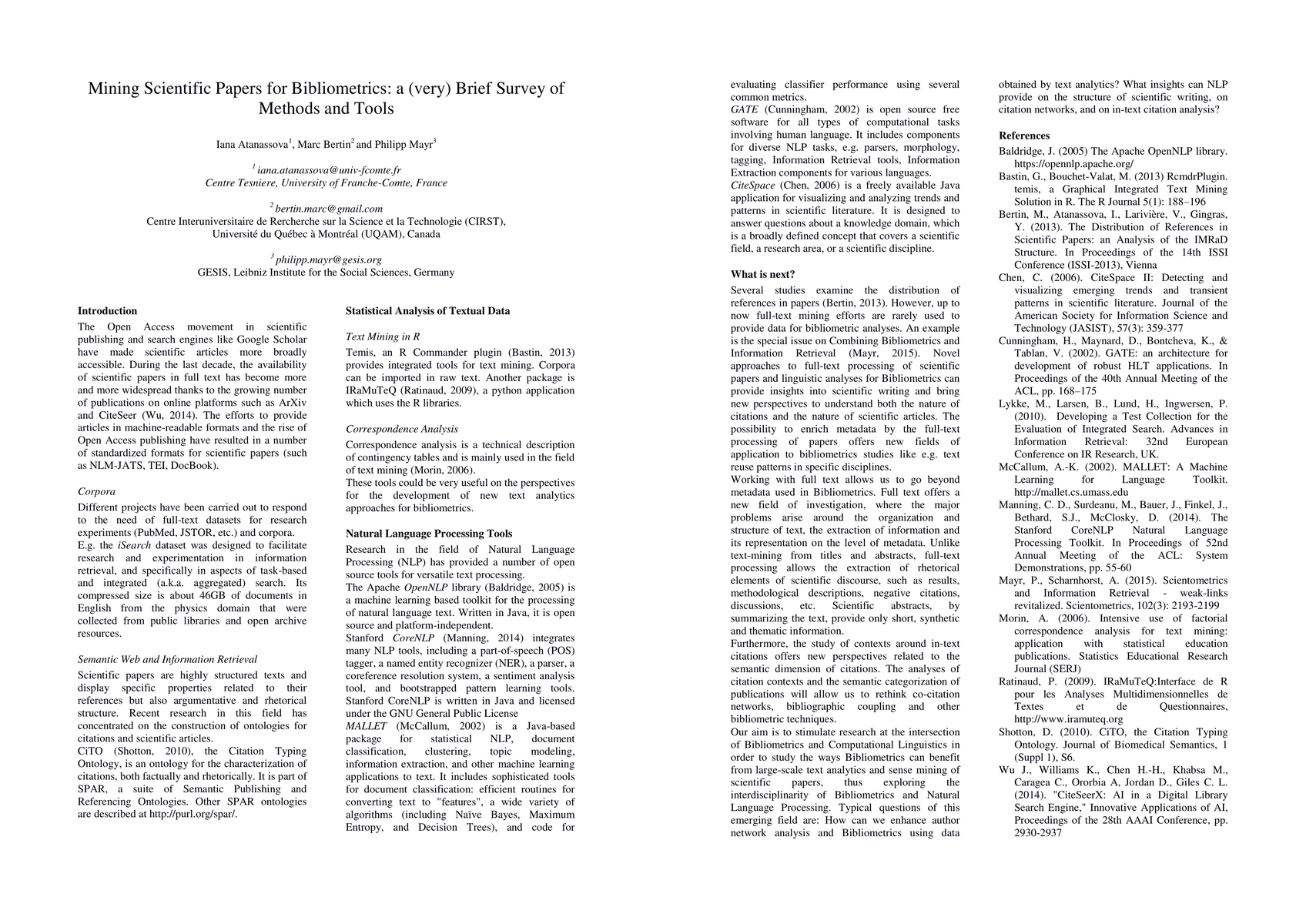 Summary: This paper surveys methods and tools for bibliometric analysis of scientific papers facilitated by open access and digital formats, emphasizing the potential of computational linguistics and text analytics to enhance bibliometrics and foster interdisciplinary research between the two fields.