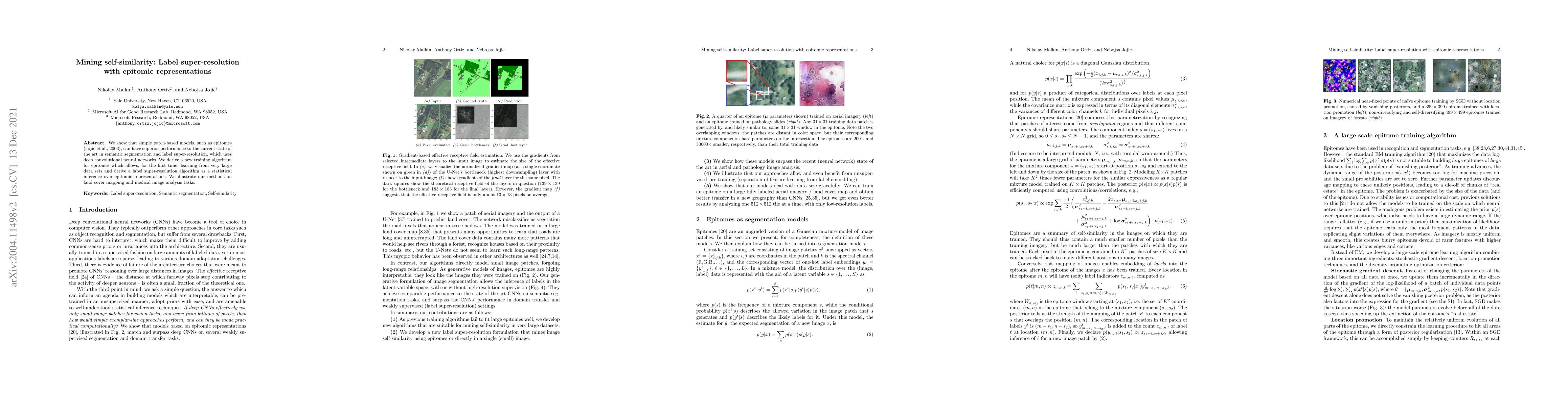 We show that simple patch-based models, such as epitomes, can have superior performance to the current state of the art in semantic segmentation and label super-resolution, which uses deep convolutional neural networks. We derive a new training algorithm for epitomes which allows, for the first time, learning from very large data sets and derive a label super-resolution algorithm as a statistical inference algorithm over epitomic representations. We illustrate our methods on land cover mapping and medical image analysis tasks.