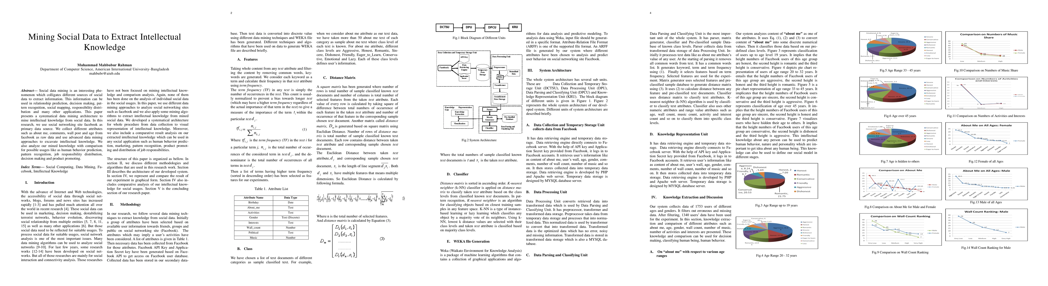 Social data mining is an interesting phe-nomenon which colligates different sources of social data to extract information. This information can be used in relationship prediction, decision making, pat-tern recognition, social mapping, responsibility distri-bution and many other applications. This paper presents a systematical data mining architecture to mine intellectual knowledge from social data. In this research, we use social networking site facebook as primary data source. We collect different attributes such as about me, comments, wall post and age from facebook as raw data and use advanced data mining approaches to excavate intellectual knowledge. We also analyze our mined knowledge with comparison for possible usages like as human behavior prediction, pattern recognition, job responsibility distribution, decision making and product promoting.