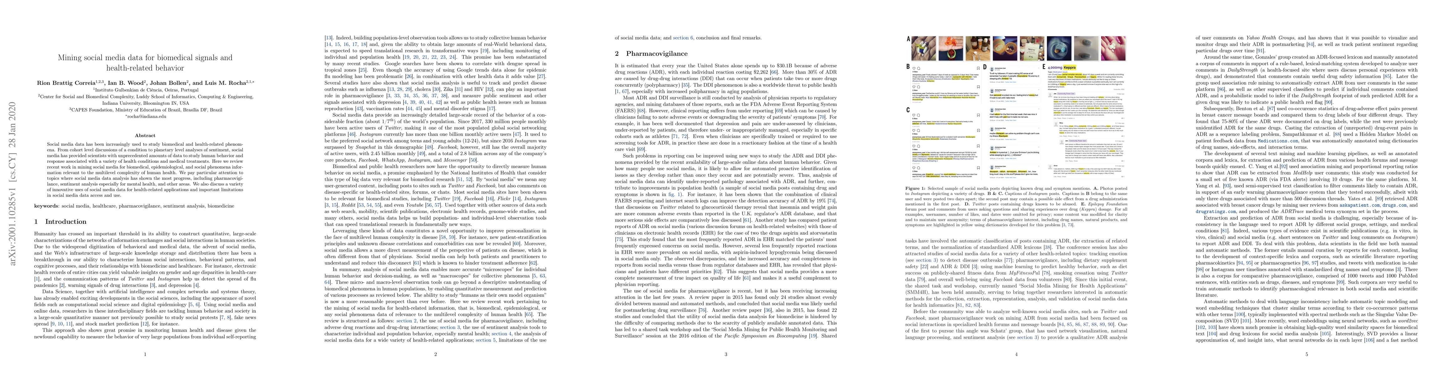 Social media data has been increasingly used to study biomedical and health-related phenomena. From cohort level discussions of a condition to planetary level analyses of sentiment, social media has provided scientists with unprecedented amounts of data to study human behavior and response associated with a variety of health conditions and medical treatments. Here we review recent work in mining social media for biomedical, epidemiological, and social phenomena information relevant to the multilevel complexity of human health. We pay particular attention to topics where social media data analysis has shown the most progress, including pharmacovigilance, sentiment analysis especially for mental health, and other areas. We also discuss a variety of innovative uses of social media data for health-related applications and important limitations in social media data access and use.