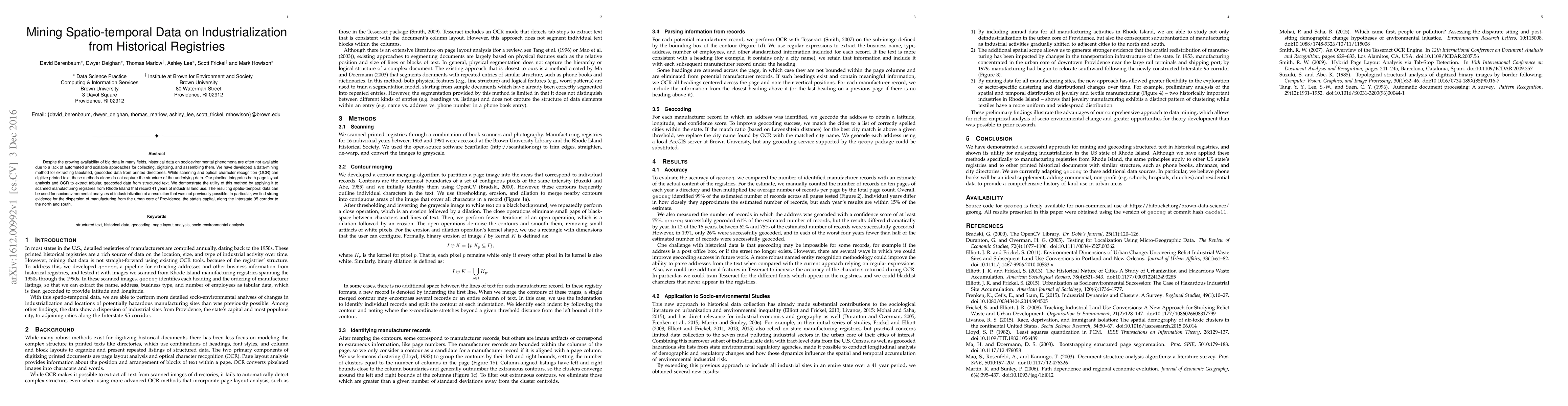 Despite the growing availability of big data in many fields, historical data on socioevironmental phenomena are often not available due to a lack of automated and scalable approaches for collecting, digitizing, and assembling them. We have developed a data-mining method for extracting tabulated, geocoded data from printed directories. While scanning and optical character recognition (OCR) can digitize printed text, these methods alone do not capture the structure of the underlying data. Our pipeline integrates both page layout analysis and OCR to extract tabular, geocoded data from structured text. We demonstrate the utility of this method by applying it to scanned manufacturing registries from Rhode Island that record 41 years of industrial land use. The resulting spatio-temporal data can be used for socioenvironmental analyses of industrialization at a resolution that was not previously possible. In particular, we find strong evidence for the dispersion of manufacturing from the urban core of Providence, the state's capital, along the Interstate 95 corridor to the north and south.