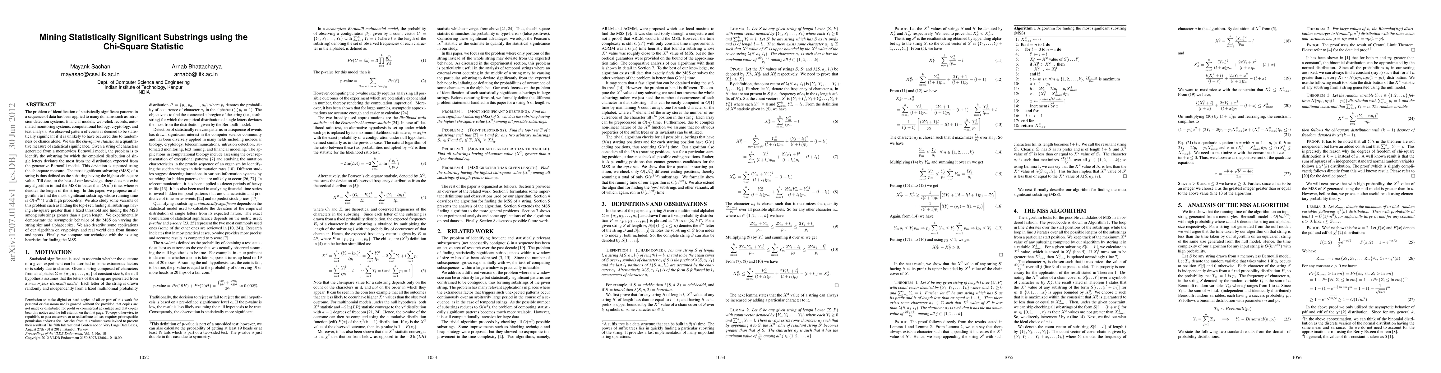 The problem of identification of statistically significant patterns in a sequence of data has been applied to many domains such as intrusion detection systems, financial models, web-click records, automated monitoring systems, computational biology, cryptology, and text analysis. An observed pattern of events is deemed to be statistically significant if it is unlikely to have occurred due to randomness or chance alone. We use the chi-square statistic as a quantitative measure of statistical significance. Given a string of characters generated from a memoryless Bernoulli model, the problem is to identify the substring for which the empirical distribution of single letters deviates the most from the distribution expected from the generative Bernoulli model. This deviation is captured using the chi-square measure. The most significant substring (MSS) of a string is thus defined as the substring having the highest chi-square value. Till date, to the best of our knowledge, there does not exist any algorithm to find the MSS in better than O(n^2) time, where n denotes the length of the string. In this paper, we propose an algorithm to find the most significant substring, whose running time is O(n^{3/2}) with high probability. We also study some variants of this problem such as finding the top-t set, finding all substrings having chi-square greater than a fixed threshold and finding the MSS among substrings greater than a given length. We experimentally demonstrate the asymptotic behavior of the MSS on varying the string size and alphabet size. We also describe some applications of our algorithm on cryptology and real world data from finance and sports. Finally, we compare our technique with the existing heuristics for finding the MSS.